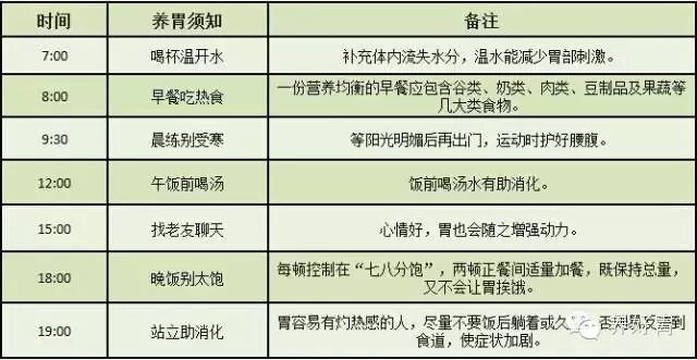 对胃不好的人而言,生活有规律尤为重要。跟着这个“养胃时刻表”,不用吃那些养胃的药,一样可以起到养胃的作用(见下表)。