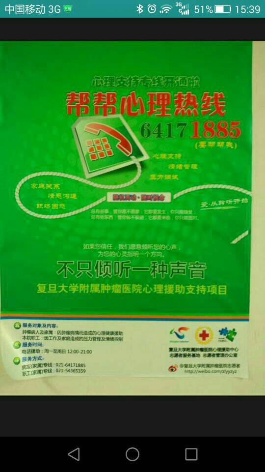 我去年4月份开刀时这个热线还没开通,再后来去检查时已经能够平静接受了。
