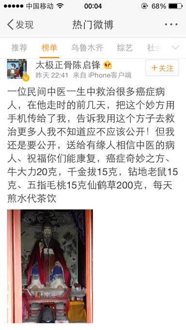 我认为是假的,中草药治不好癌症的!西医能找出病因病理,针对用药,中医行吗?虽然化疗药物有的是从植物提取的,那必是提取提纯的少量有用成份,而中草药什么成份都有,这种草叶根行吗?我父亲去年也听信网上宣传的贵州李正磊什么中药泡澡,我父亲泡几个月一点用也没有!希望大家在治疗这种大病上不要轻信中药,小病小痛中药还是可以!