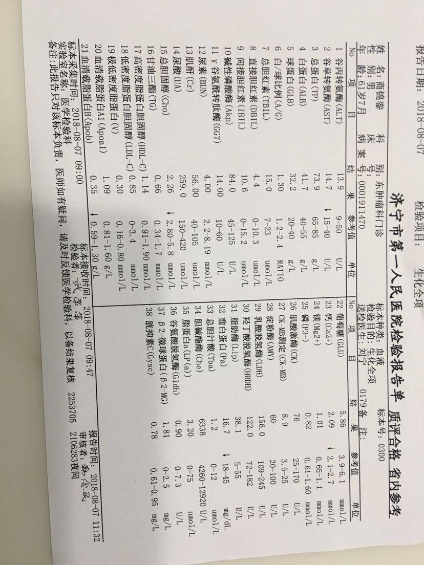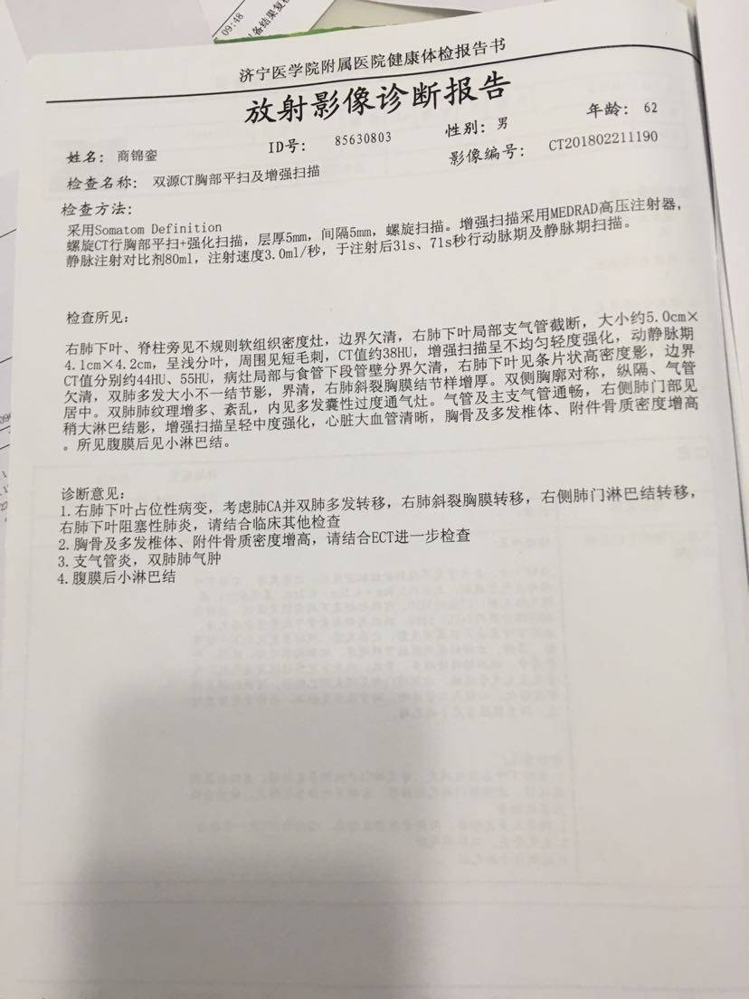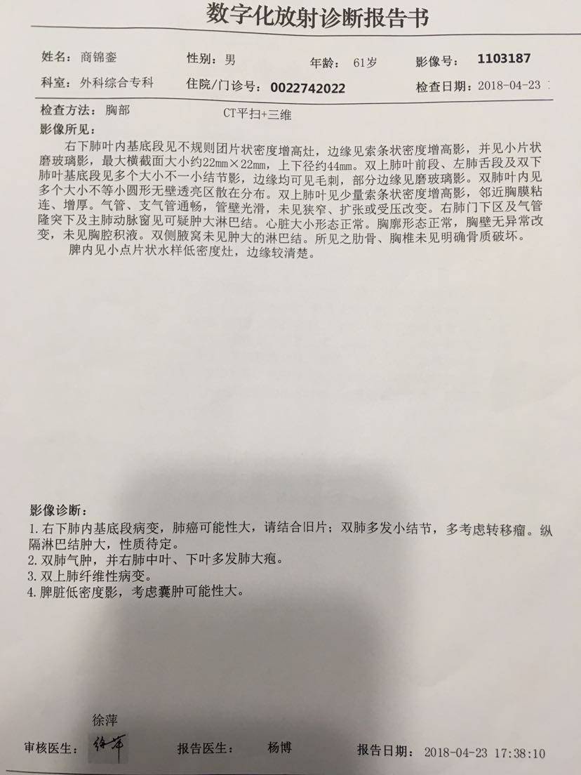 2月份做的增强CT四月份靶向药一个月做的CT靶向药四个月的CT,真的很开心……希望靶向药继续长长久久走下去,另外附上这个月的血液报告