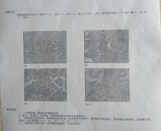 跟我妈妈的一样,不过我妈妈一个淋巴转移,二阴一阳 8次化疗 Ki也是60%,前四次多柔比星 后四次紫杉醇 ,靶向治疗还要做一个检测看什么药物好