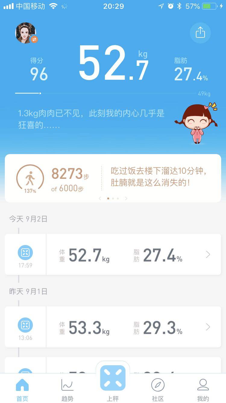 我每天徒步走40分钟,从今年4月1号开始的,到如今已经瘦了10斤了!徒步走好处太多了!晚上带帽子走没人看的,不奇怪!头发很快就会长出来的呦!你那个体脂秤是下载的么?