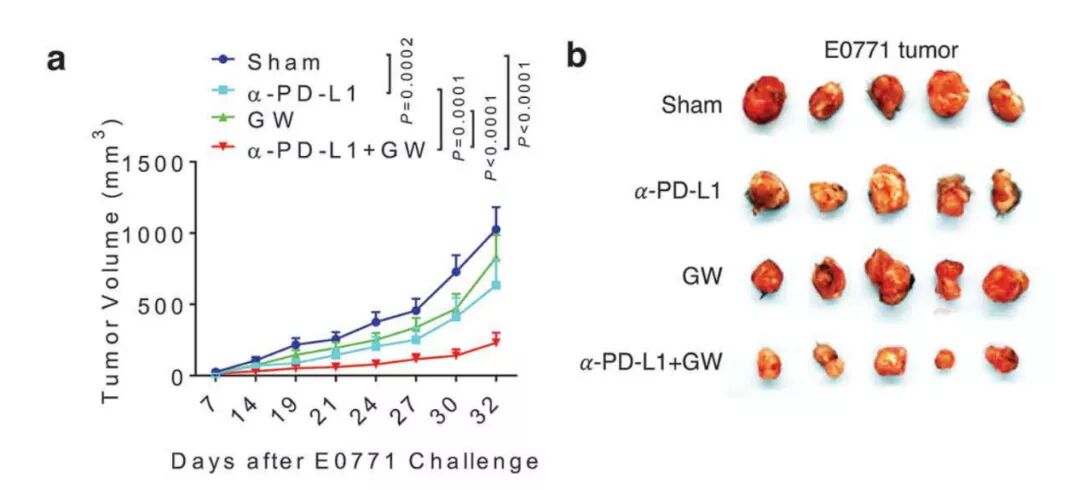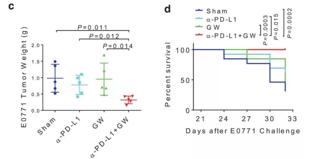 更重要的是,使用GW9662与PD-L1治疗小鼠在实验的33天内,全部存活,存活率达100%!而其他组的小鼠都或多或少由于肿瘤的发展一命呜呼。
