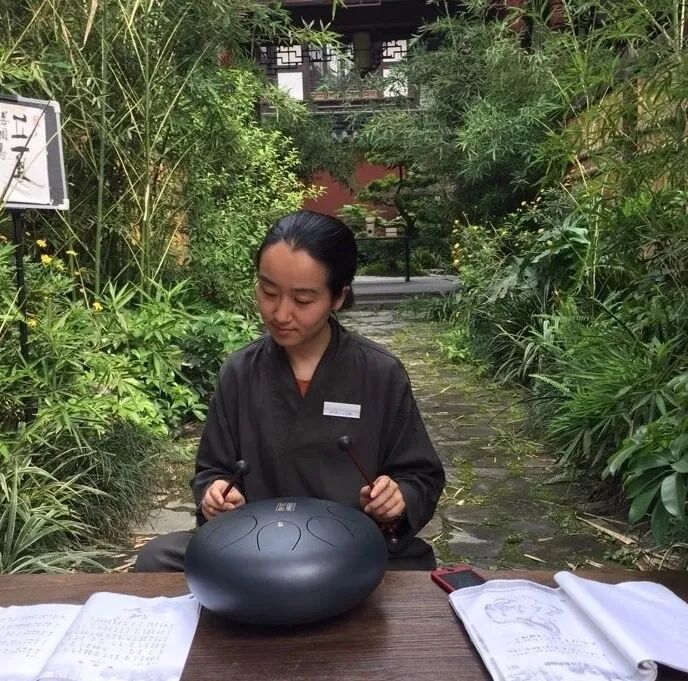 文殊茶园内敲着羽磬的姑娘。羽磬的声音极美。