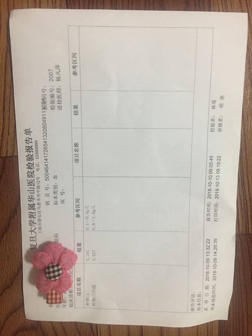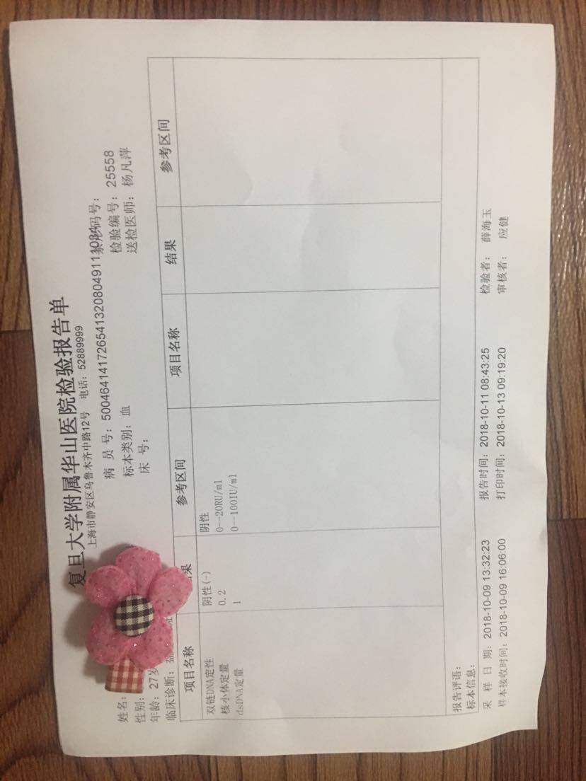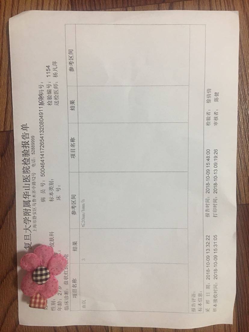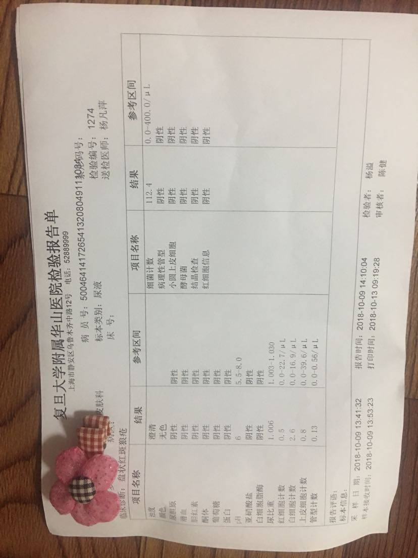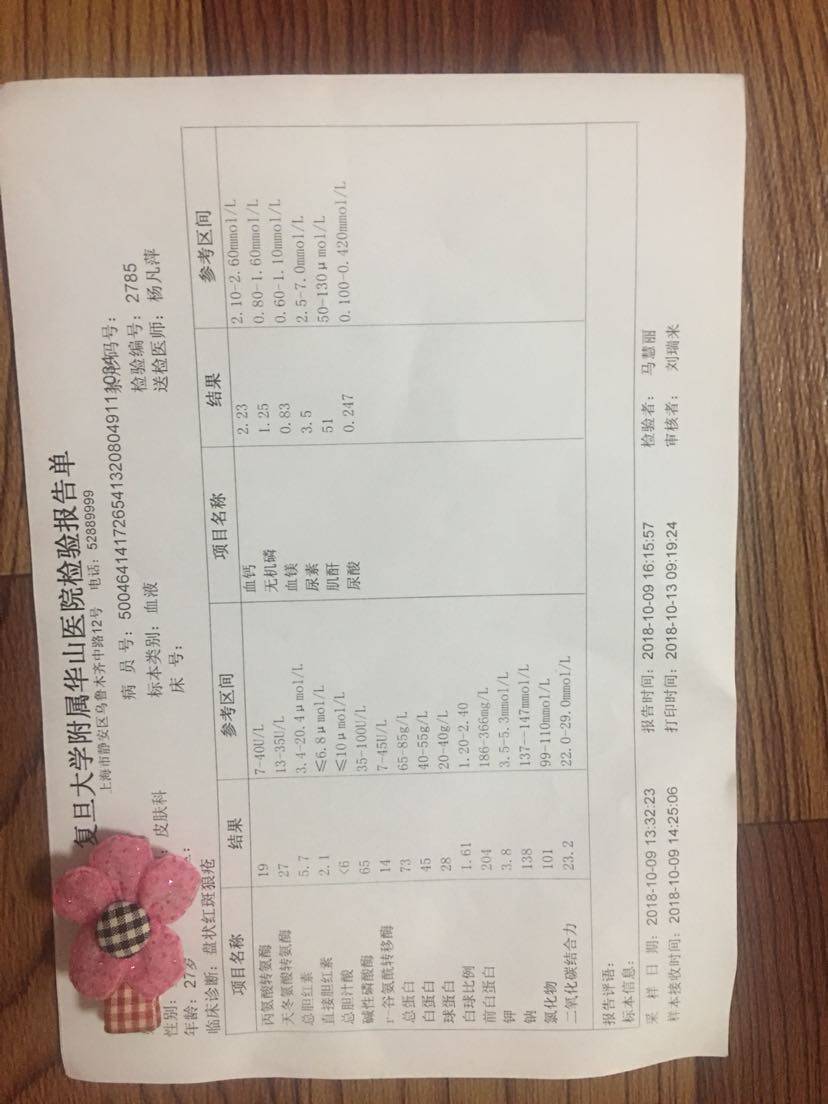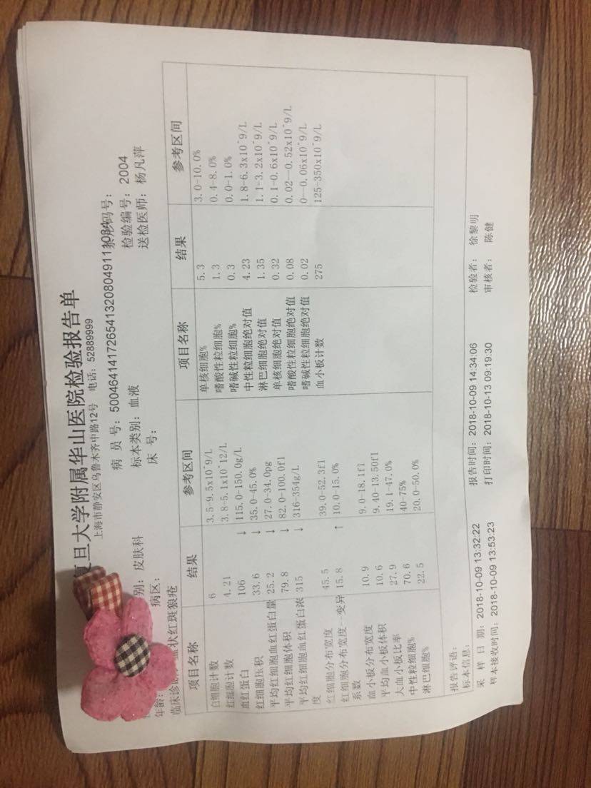 这次检查结果应该还不错吧,周六早上拿报告那天华山医院和仁济医院的皮肤科都没号了,下午有其他事情要去做所以没有等了,所以还没给医生看报告,不知道能不能减药。
