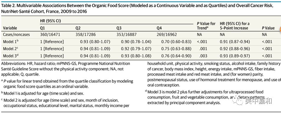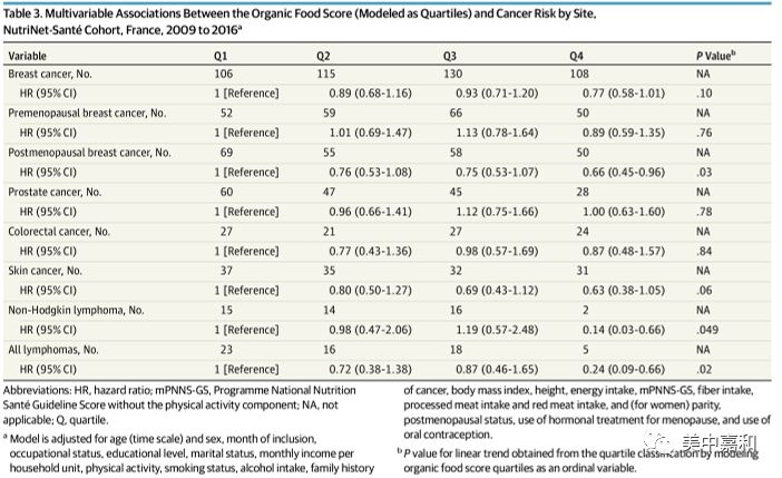 有机食物真的能预防肿瘤发生吗? 这项纳入68946名研究对象,平均随访时间为4.56年的研究显示:有机食物摄入频率高,可降低25%肿瘤总体发生风险,尤其可降低86%的NHL(非霍奇金淋巴瘤)、66%所有淋巴瘤和34%的绝经后乳腺癌发生风险。 研究人员表示,尽管该研究结果还需要确认,但促进一般人群中的有机食物消费可能是一种有前景的肿瘤预防策略。 什么是有机食物? 有机食物(Organic food)是不经过化肥、农药、除草剂等污染的食物,而且肥料必须用自然堆肥,凡是任何加害土壤的添加物,都不可使用。 消费者在判断食物是否为有机食物时,切记不要只听商家的宣传,有机食物认证严格,必须有合法的有机食物认证机构对食物的生产、加工、储存、运输和销售等环节进行认证,以确保均符合有机食物的标准。大家一定要注意鉴别! 中国有机食物标志 这项试验是怎么做的? 试验设计 这是一项基于网络的法国前瞻性的研究,研究时间从2009年到2016年,共68946名自愿参与的研究对象通过网络问卷形式反馈相关信息。 数据采集 1.了解研究对象的人口统计学和生活方式、健康状况、体力活动、人体测量学和饮食等基线状况。 2.了解研究对象对16类有机食物的消费频率,以有机食物评分方式展现(范围:0-32分)。 3.了解研究对象的年度健康状况,确认是否患肿瘤。 研究结果 有机食物摄入频率高,可降低25%肿瘤总体发生风险。 研究使用有机食物评分(0-32分)的四分位数(Q1-Q4)作为序数变量进行线性趋势的研究。研究排除了性别、收入、受教育程度等多种因素影响(详情请看表1)。 高有机食物评分与肿瘤总体风险呈线性负相关。(Q4 vs Q1:HR=0.75; 95%CI,0.63-0.88; P = .001); 去除早期肿瘤病例后,总体负向关联仍然显著(Q4 vs Q1:HR=0.70; 95%CI,0.56-0.88;趋势P = .004); 其他额外的饮食因素并没有改变研究结果。 表 1 有机食物评分与肿瘤总体风险的关系 有机食物摄入频率高可降低3类肿瘤的发生风险。 在有机食物的消费与肿瘤部位的关系上。研究结果显示:高有机食物评分与绝经后乳腺癌、NHL和所有淋巴瘤之间存在负相关(分别降低34%、86%、66%的发生风险)。与其他肿瘤部位没有观察到任何关联(详情请看表2)。 表 2 有机食物评分与不同肿瘤风险的关系 知其所以然 为什么有机食物会让肿瘤风险降低? 研究人员指出,本文观察到的有机食物消费频率与肿瘤风险之间存在负相关性的一个可能原因是:与传统食品相比,有机食物有更少的农药污染或根本就无污染。既往研究发现,有机食物可降低人体尿液中致癌性的农药残留物,有些是被国际肿瘤研究机构列为2类致癌物(马拉硫磷、二嗪农被列2A类致癌物,四氯噻嗪、对硫磷被列为2B类致癌物)。 此研究是首个关于有机食物消费频率与肿瘤风险关系的研究,在一般人群中,关于食物中农药残留与致癌性的大规模研究很少,因此,还需要进一步研究,以确定哪些特定因素导致了有机食物消费对肿瘤风险的潜在保护作用。 人们消费有机食物面临哪些困难? 虽然有机食物(本研究结果)对于降低特定肿瘤的风险可能很重要,但有机食物的高价仍然是一个重要的障碍。 研究的局限性 本研究的优势在于其前瞻性的设计和大样本量,使研究人员能够对不同的肿瘤部位进行分层分析。此外,研究使用了有关食品频率和肿瘤病例临床验证的详细调查问卷。 研究人员也指出了此研究存在的一些局限性。 自愿入组研究对象可能是特别注重健康的人,可能限制了研究结果的普遍性。 虽然研究中的有机食物频率是使用特定问卷收集的,但没有严格的定量消费数据。 随访时间很短,这可能限制了因果推断,以及特定部位(如结肠直肠癌)的统计结果的效力。 结果可能受到残余混杂因素的影响,虽然已尽可能考虑到混杂因素,例如饮食模式和其他生活方式因素。 不能排除一些肿瘤病例未被检测出。 参考文献 [1] Association of Frequency of Organic Food Consumption With Cancer RiskFindings From the NutriNet-Santé Prospective Cohort Study