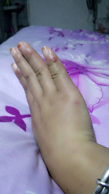 我俩的一模一样,我手上也开始起了。按着有点疼。还痒。医生给我开了擦的药膏