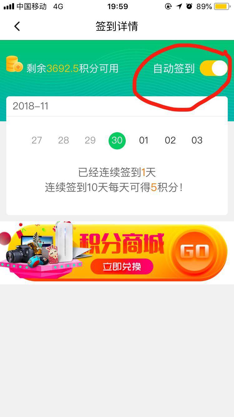 3、自动签到,防止漏签,在点击首页签到按钮进入可以关闭自动签到功能,妈妈再也不用担心我漏签到啦~