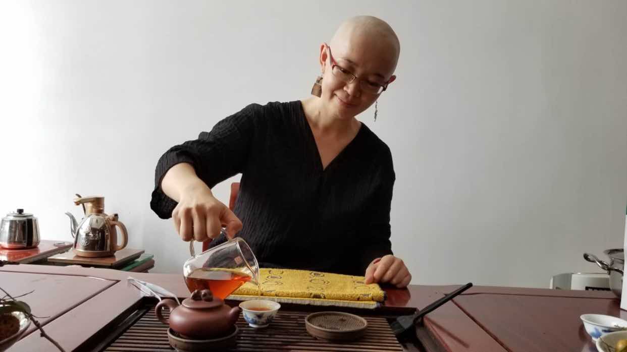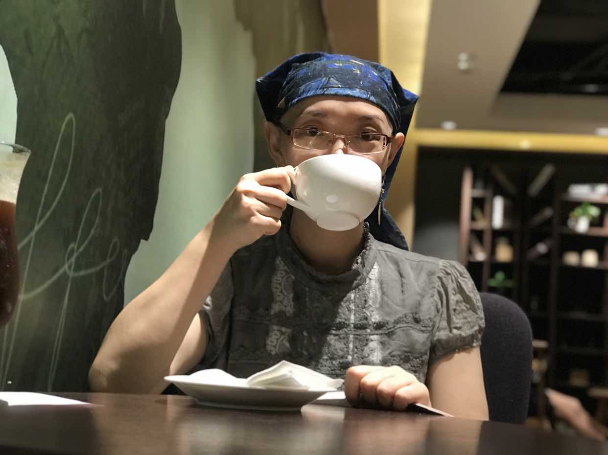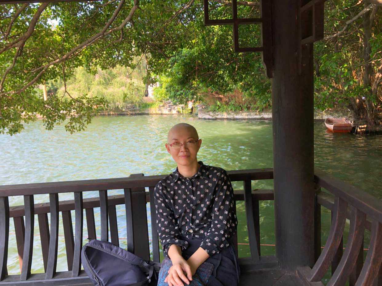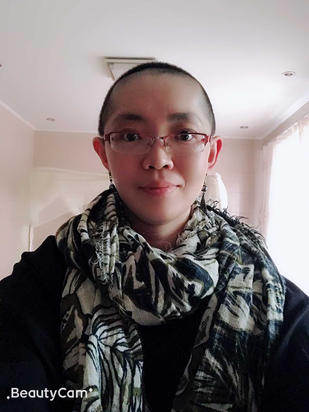 因为化疗,几个月都是光头,其实那段日子也是淡然的追求美的,没有头发,夏天如此凉爽也不用洗头发,而且每天换不同的头巾,很开心。光头期间还拍了艺术照。那是一段特殊的印记,没有伤痛,仿佛是一个演员,体验了一部戏的时间。入戏太深会伤心,人生如戏,戏如人生~