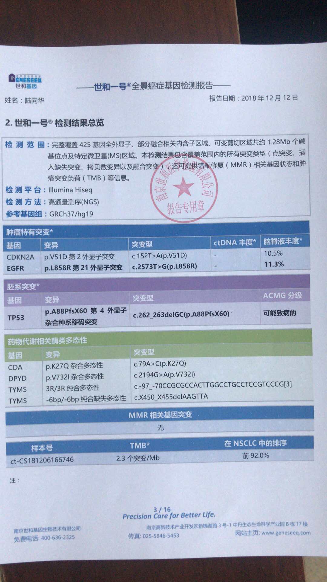 2 脑脊液基因检测 :曾出现过的T790M 突变没有了!泰瑞沙服用时效果也不好,会全脑做放疗13次有缩小但人很难受放弃