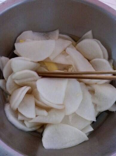 然后切片,用盐洒在萝卜上翻两番,让萝卜的涩味去掉,我妈用了一晚上哦,你们看看吧。第二天就洗洗干净,然后就开始咯,放在盘子里,加醋,加白糖,调味,放那么半个小时吧,味道都ok啦我妈妈加了姜片,这样就不会那么寒咯。加几片就好了,不用多,希望你们也做的棒棒的,闻着都留口水。