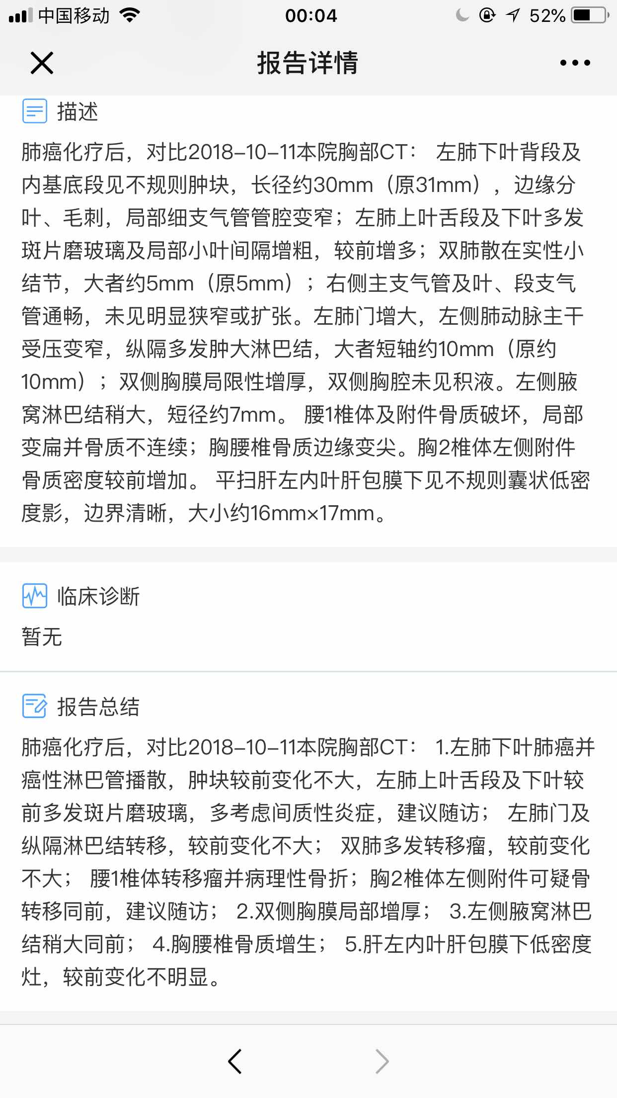 下面是第七次化疗(培美曲塞、奥美拉唑)以后的CT扫描结果,很多指标都相比之前有扩张的趋势,非常不稳定,大半年过去了,为什么不见有好转?而且,现在老爸的声带完全发不出声音,肺动脉压住了声带导致的。
