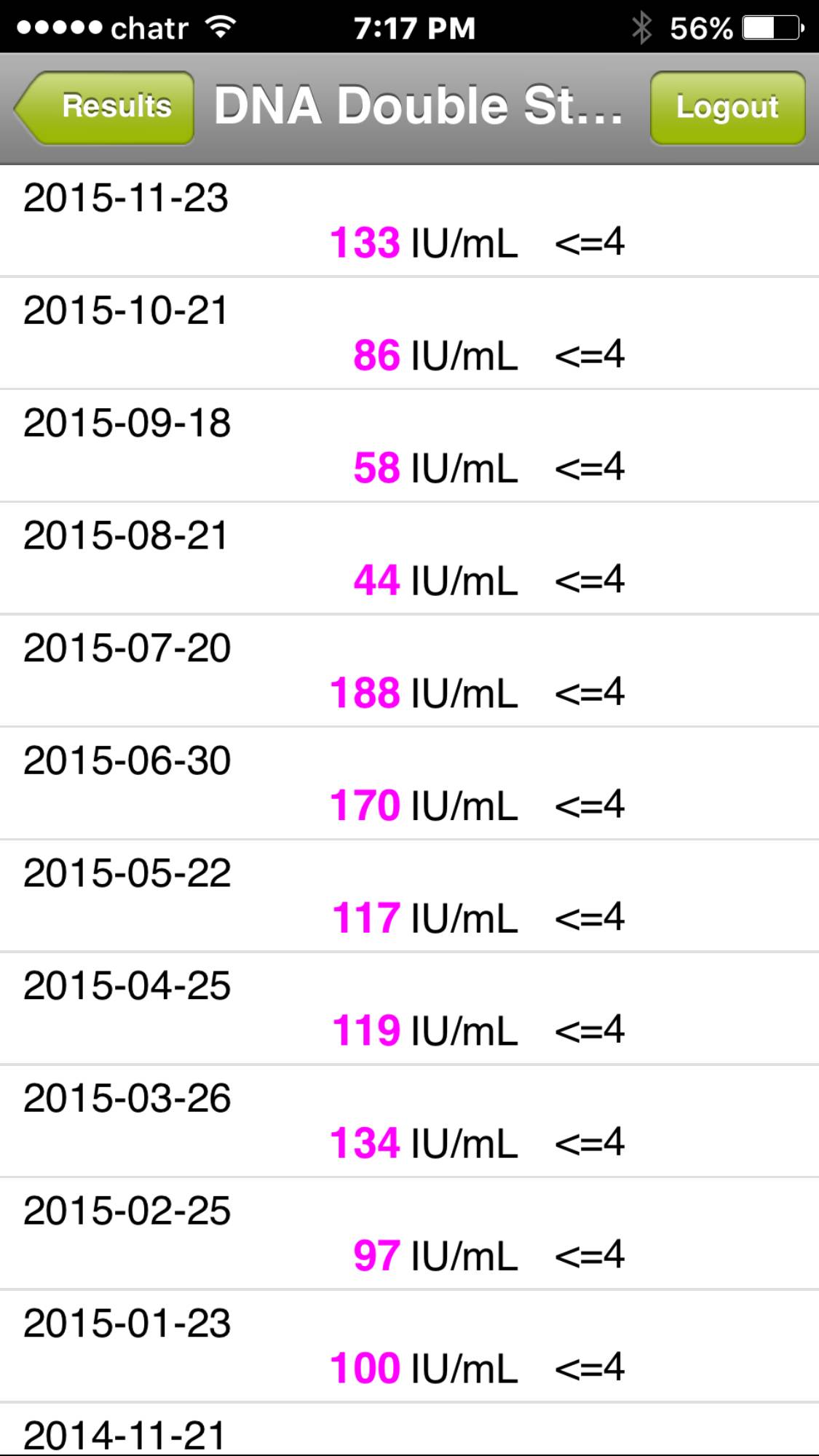 我今天才刚刚化验过,抗双链抗体又高上去了。影响的因素很多啊,心情,精神压力,药物,劳累,不能急啊!