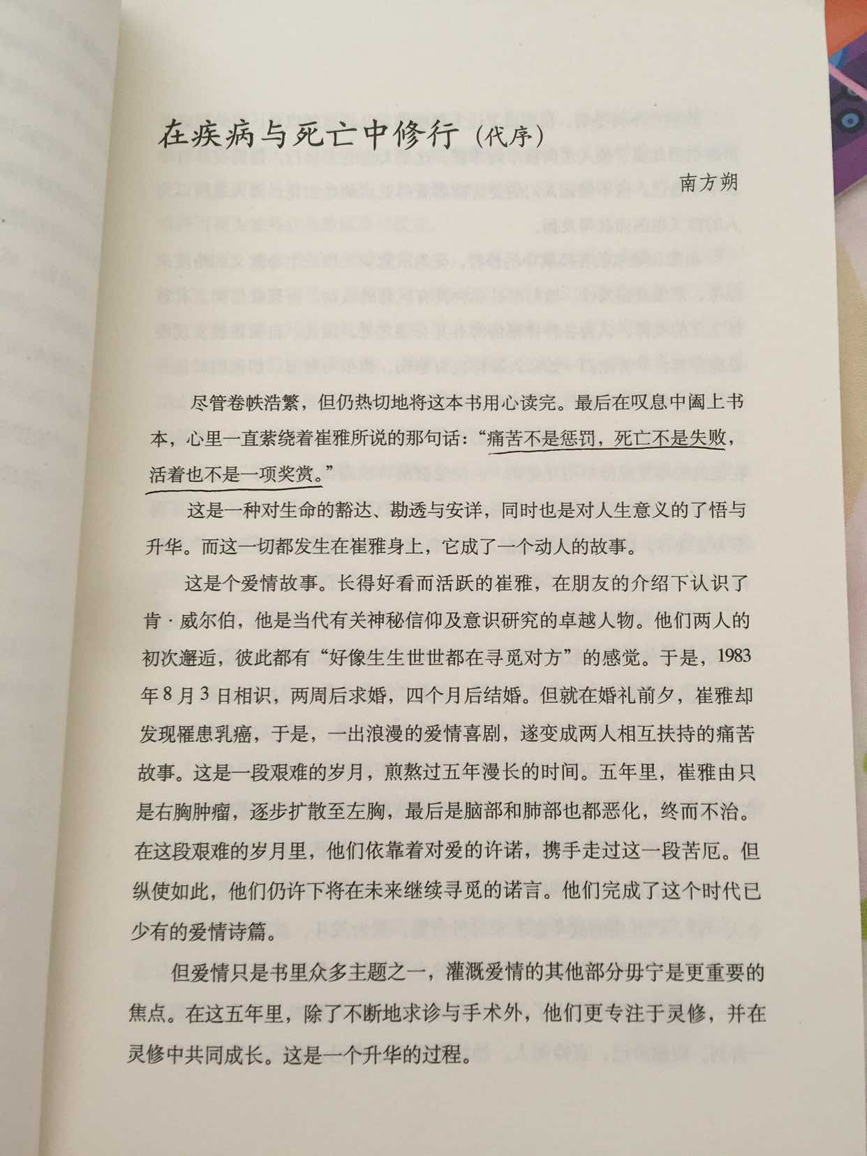 书中最深奥之处是主人公在灵修上的高深,能够通过静修,自他交换做到天人合一,能体会到更高层次的感觉,所以面对死亡就非常平和。假如我们都能悟到佛家说的万事万物皆是空,人生就是一场苦难,众生都在受苦,对于所有事情都坦然面对,平和接受一切,就达到了灵修的境界,崔雅做到了,她死的很安详,她对死亡做到了超脱的境界。假如我们都不惧怕死亡,也就不惧怕疾病,不惧怕复发。活着,就要珍惜生命,好好得活,有勇气开放、接纳、成长。面对死亡,也毫不畏惧,该走的时候就坦然地走。