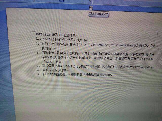 十月初化疗等一回,方案,紫杉醇 铂,十月底CT复查结果如图一