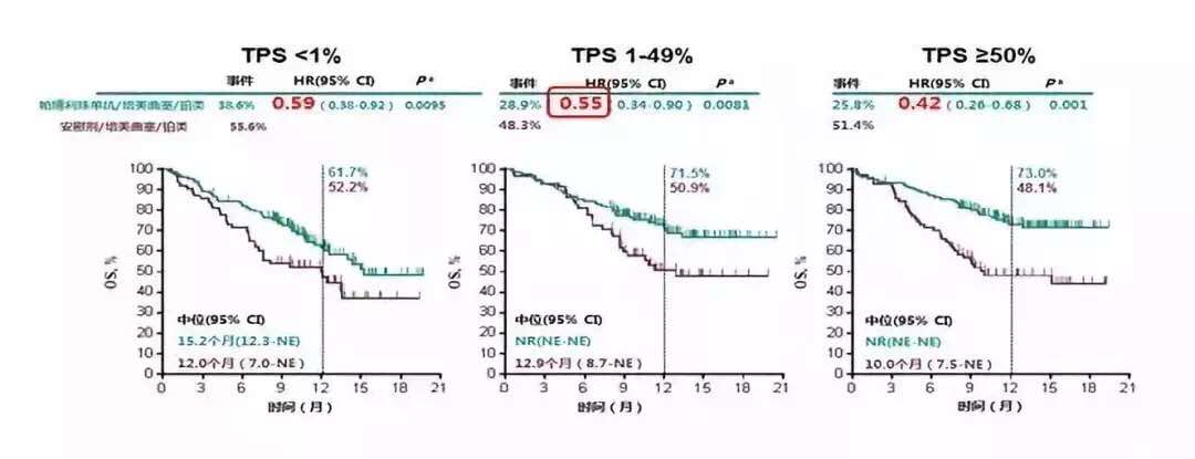 而pdl1>50的,病情进展不明显的,能单药还有必要联合吗?答案是肯定的,对于高表达的,联合的有效率和生存期,也是比单药高。下图是pdl1阴影,pdl1 1~49%以及>50%三种情况,免疫联合化疗和单化疗的对比:(绿色k➕c,黑色单化疗)