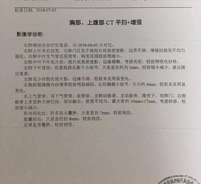 4月份培美曲塞单针化疗结束后复查效果不理想,教授说虽然基因检测是阴性,但是可以试一试靶向药,临床上也有阴性吃了靶向药肿瘤有缩小的,所以我们决定试一试,爸爸5月开始吃阿帕替尼,每天250mg,一天一次,服药期间严密观察心率血压,每月上广州复查,药量也是开的一个月的,爸爸吃了2个月后,复查显示病情有所好转,病灶小了。