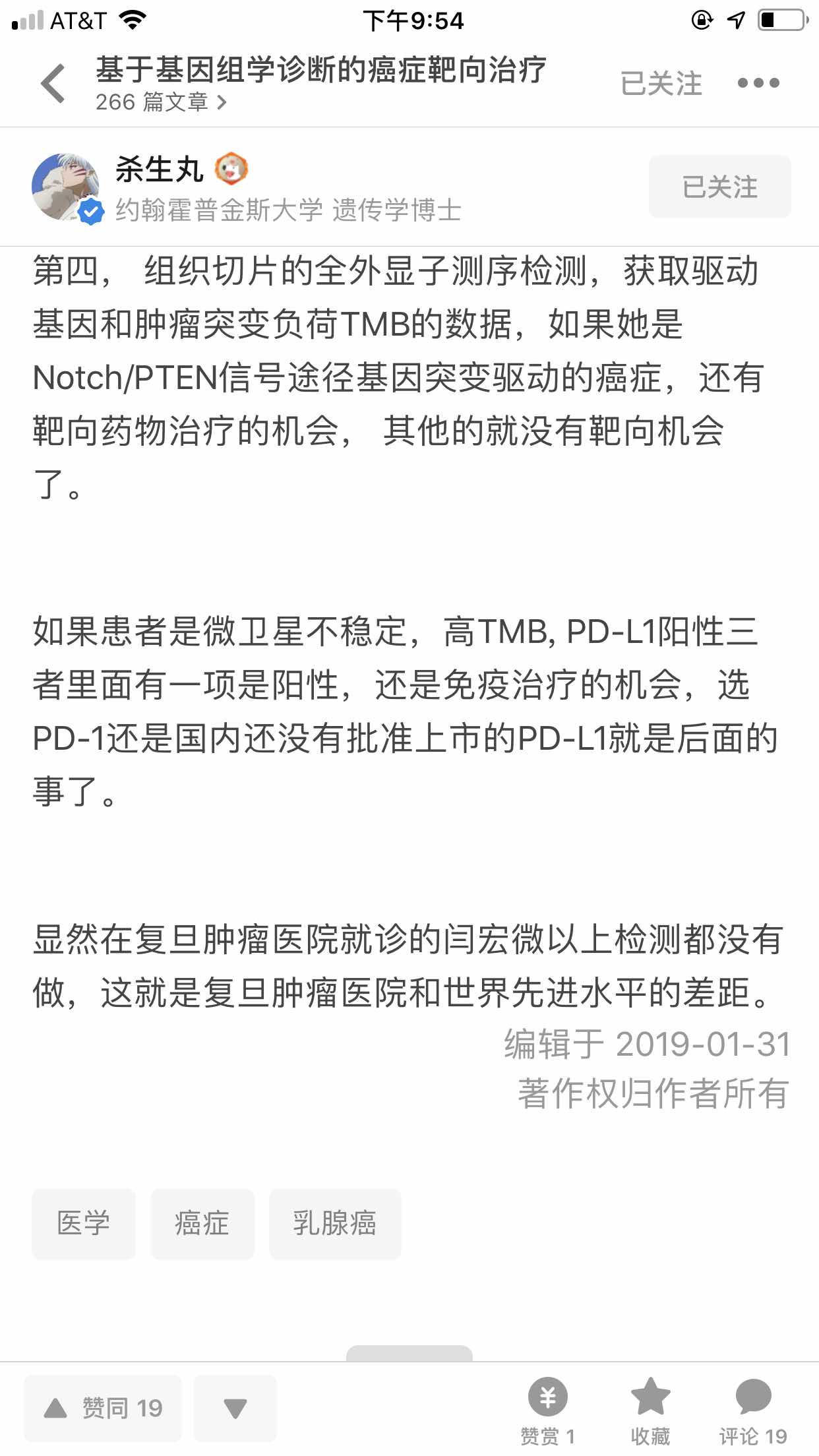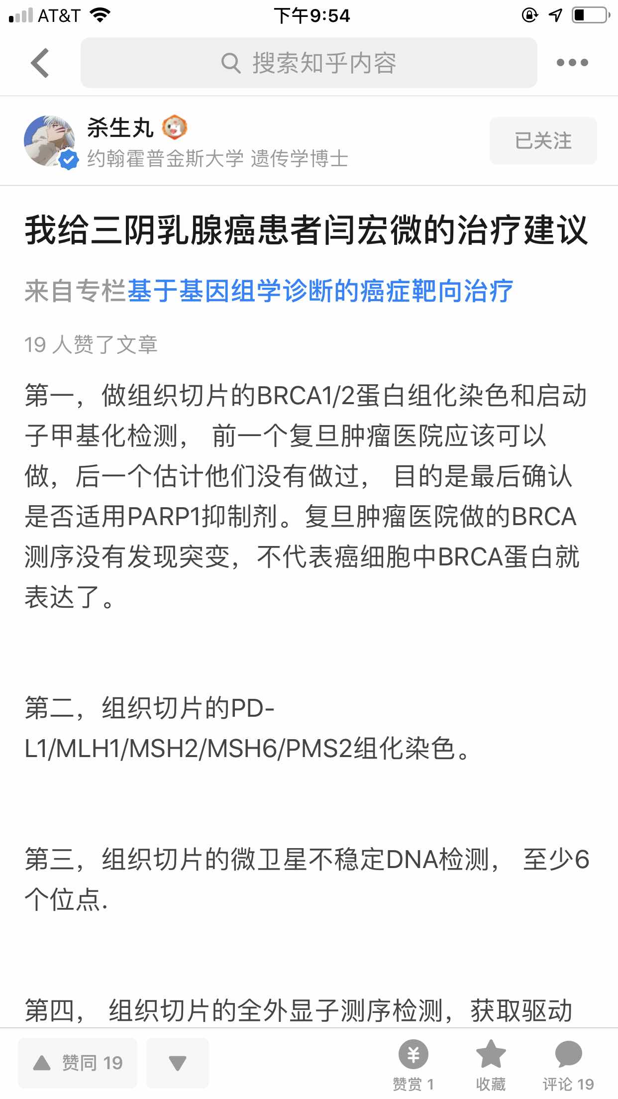 最近逛知乎,恰好看见这位博士发布的美国对三阴乳腺癌的更前沿的治疗方案,即进行多种基因检测来找到精准治疗突破点。在和博士取得联系之后,他给了我妈妈一个建议,先测brca和微卫星不稳定DNA,如果都为阴性再试试全外显子测序,具体文章见图。目前我妈刚做完brca,等待结果,也在联系做微卫星DNA的公司。希望带给各位一些有效信息。