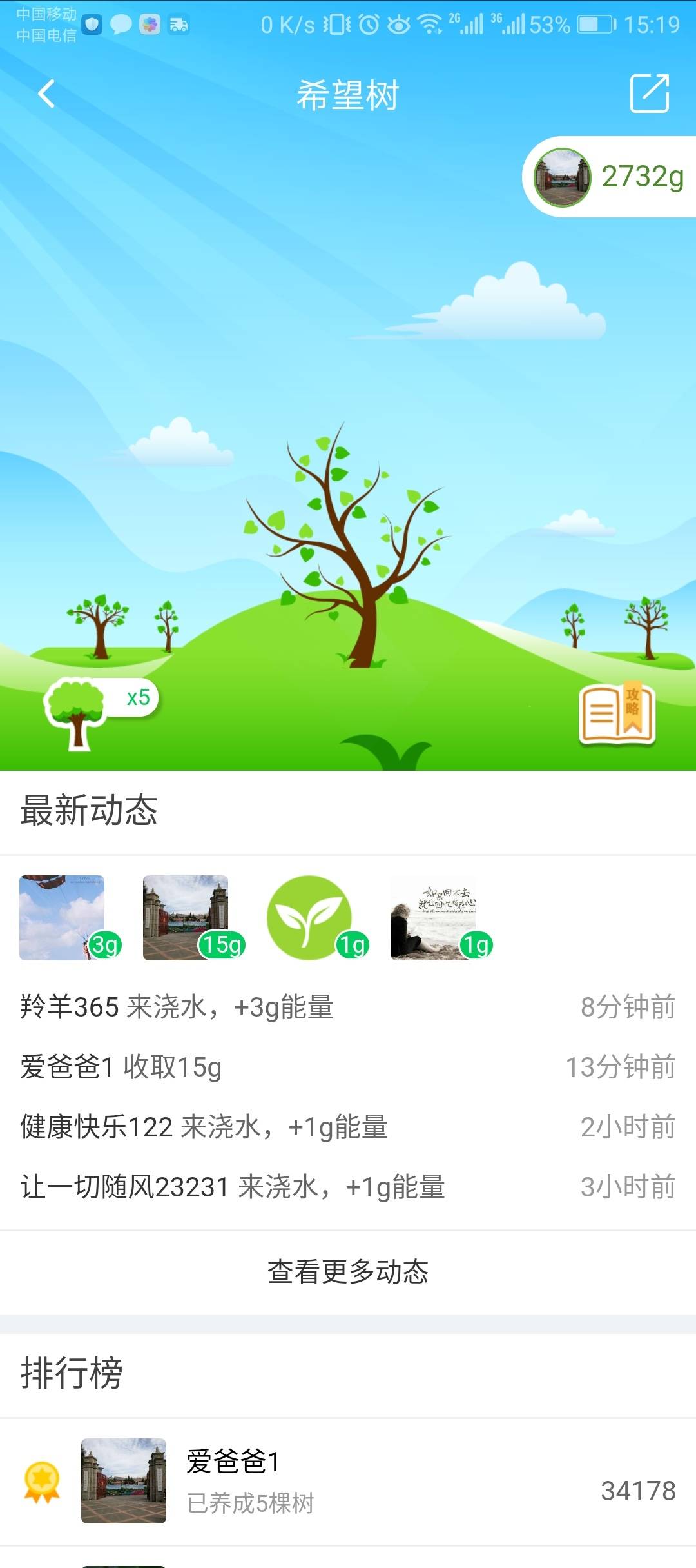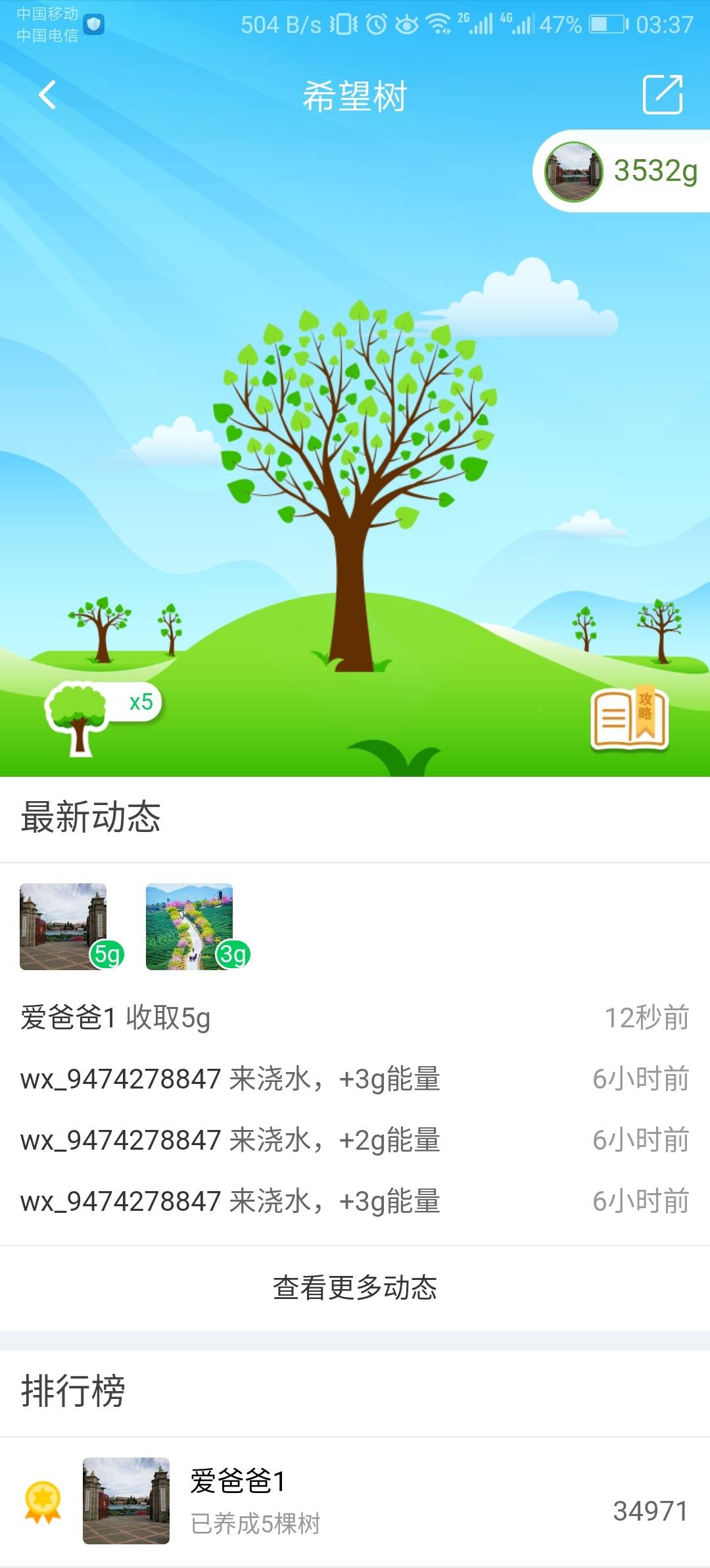 感谢所有的觅友们的支持,助我已经种植了5棵希望树,获得能量32964g,第6棵希望树正在茁壮成长,能量数1487g!