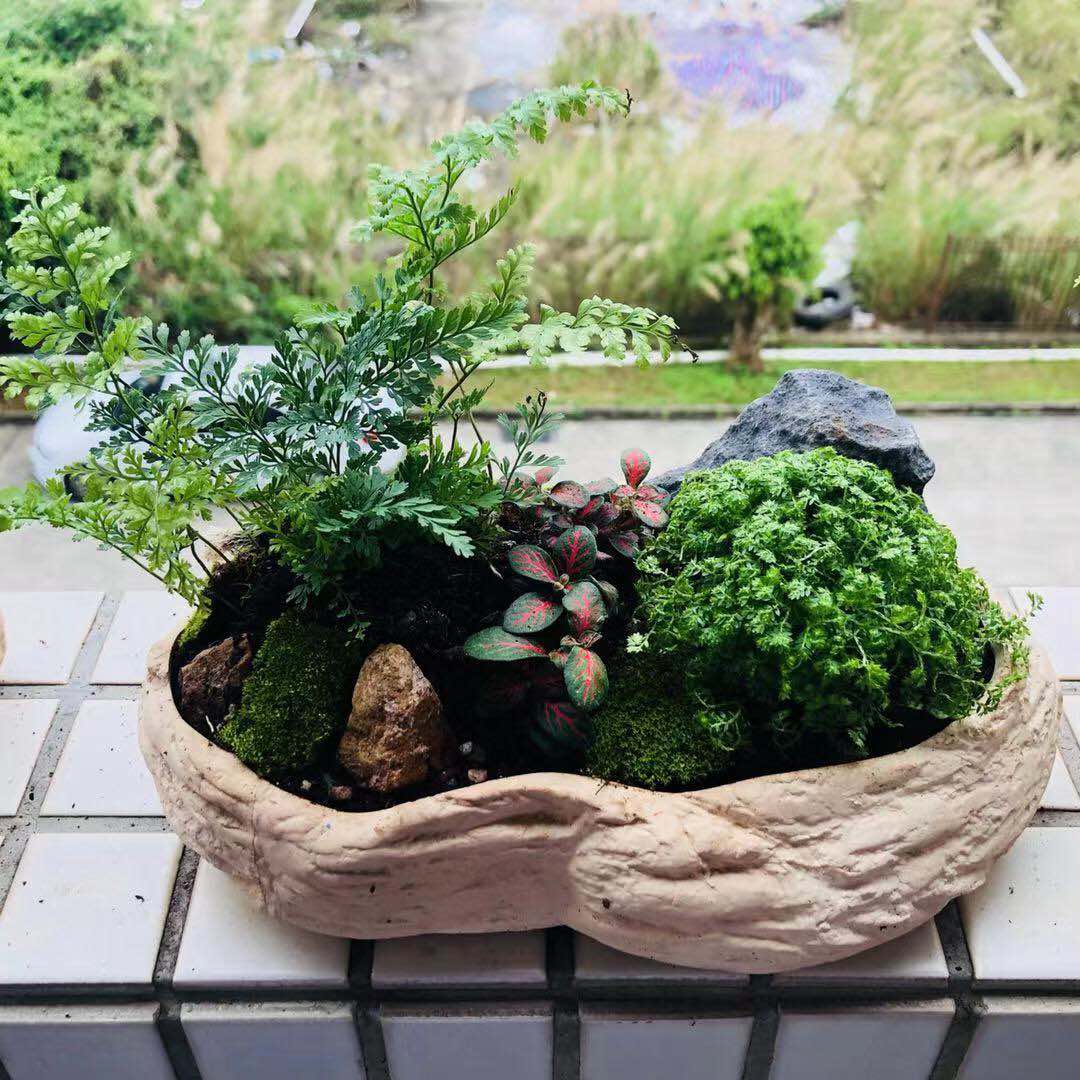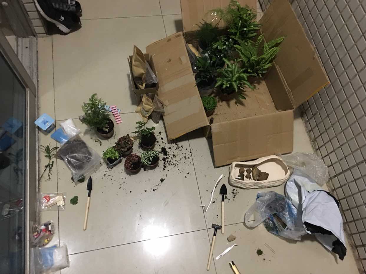 东西到的比预计的时间早,怕花草捂坏了就在宿舍开工了,坐在地上从7点搞到11点半,搞完以后觉得不完美,又打着手电筒去楼下挖苔藓,完成的时候腰酸的都不行了!😂第二天早上起来脚腕都疼。