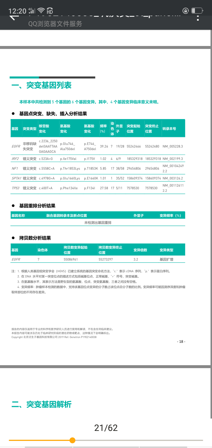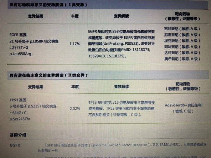 你好,陈医生。我母亲于2017年4月份查出肺腺癌IIIB伴锁骨淋巴转移,之后进行了6次培美 纳达铂化疗进展,纵横淋巴转移。之后检测有egfr 19缺失,吃易瑞沙6个月后无效,又双肺转移。之后盲吃9291有效10个月后,骨转胸椎T4节,然后对骨转进行了放疗13次处理,之后每月打一次骨转针,9291 培美化疗了两次后,又多发性骨转(胸椎,股骨,骨盆转移)医生给换方案,贝伐 紫衫醇 顺铂2次后又进展,胰腺和右肾有转移灶,胰腺转移病灶大些,右肾病灶很小,然后我们立马做了全基因检测,是egfr 19突变。吃的阿法替尼 184,吃到28天复查,肺部比之前有缩小,其余转移灶跟之前变化不著。下面是我母亲的血液基因检测,想请问下陈医生,胰腺转移可以单独用什么办法处理一下吗?胰腺可以做介入或者放疗吗?请问我母亲靶向药耐药后可以尝试免疫治疗吗?