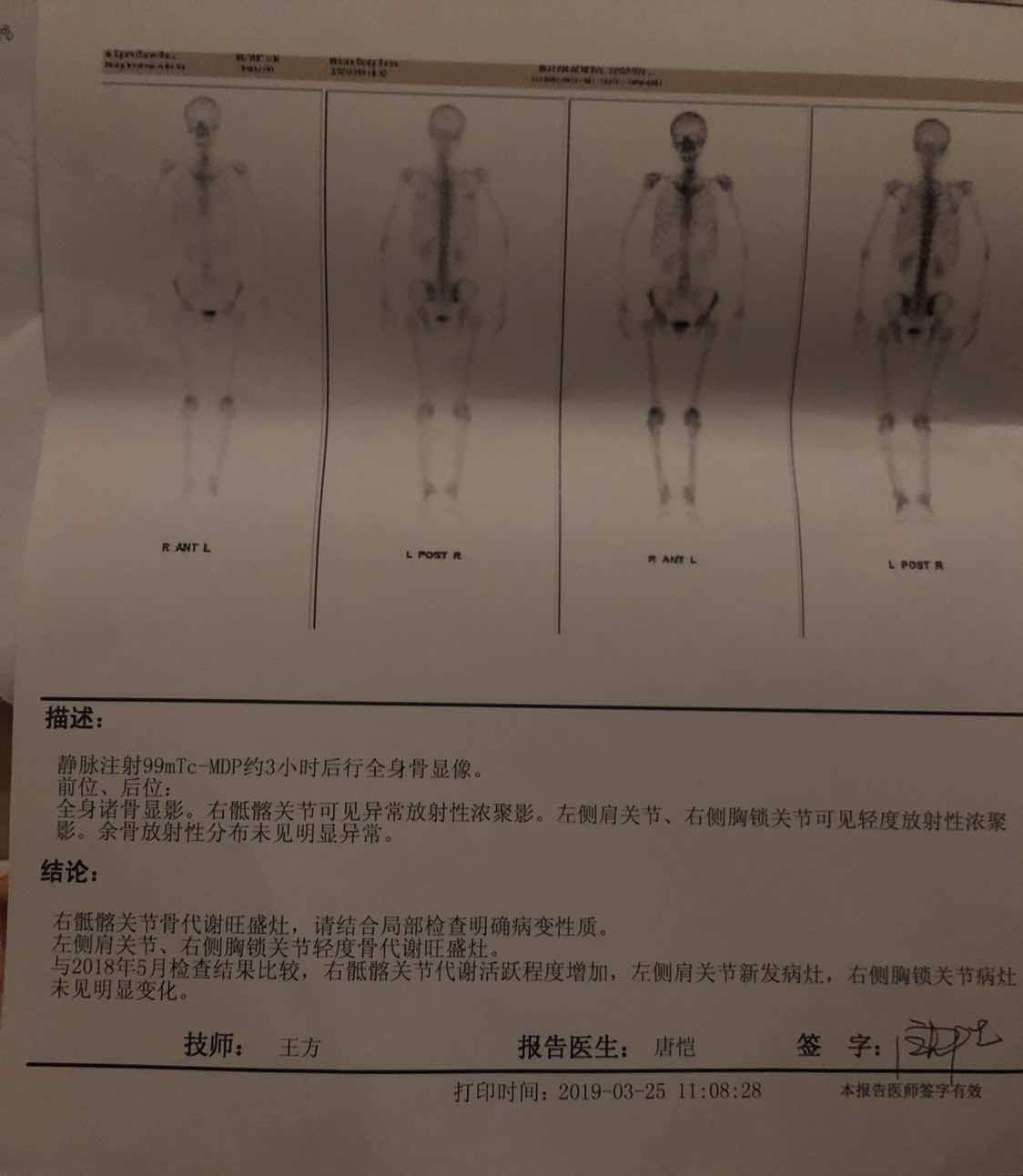 今天做了全身骨扫描,这个结果不知是怎样的原因?再就是我术后双肢还不能完全伸直(去年四月十六号手术右侧)左侧手臂PICC管拔后至今已半年多了也没完全恢复,化疗结束后服莱曲唑快俩月时双手指关节和腿关节都伸缩起蹬不太自如;请教各位姐妹!