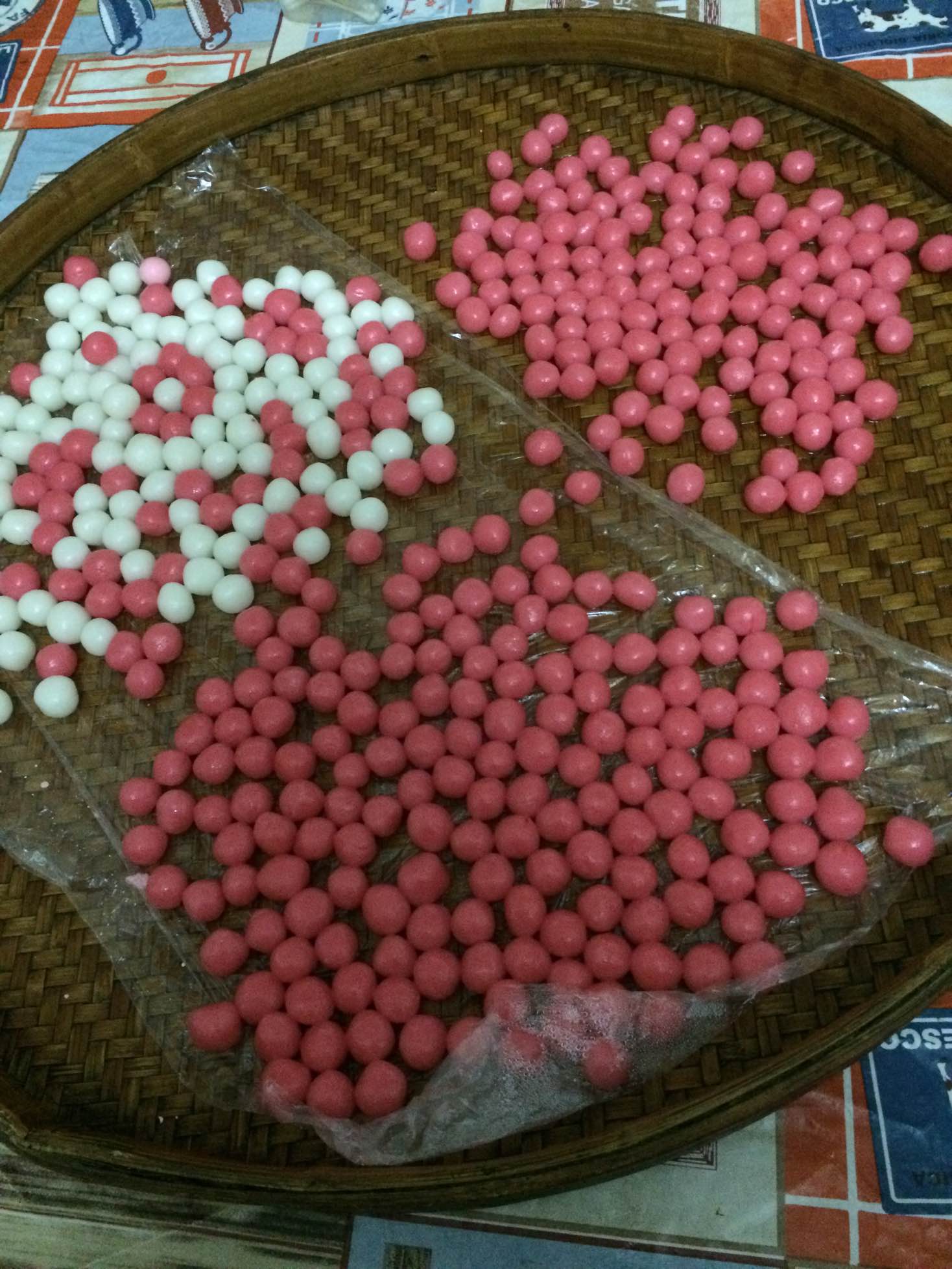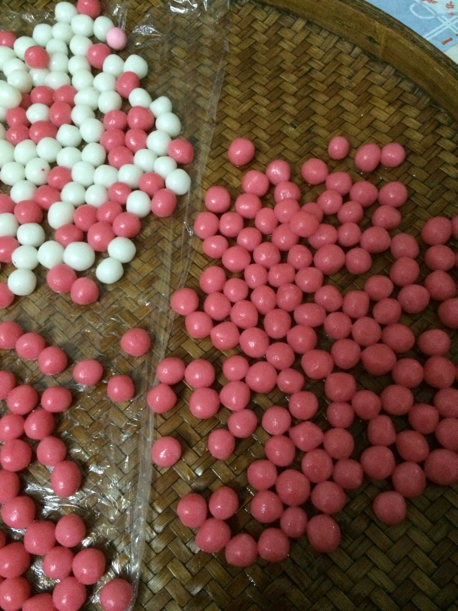 今天下午老妈在做圆子,明天是冬至了。。我们这的习俗要吃圆子。。。红的白的。。好看。。。在加点汤圆就更好了。。。看妈还包了菜粿。。晚上吃。。