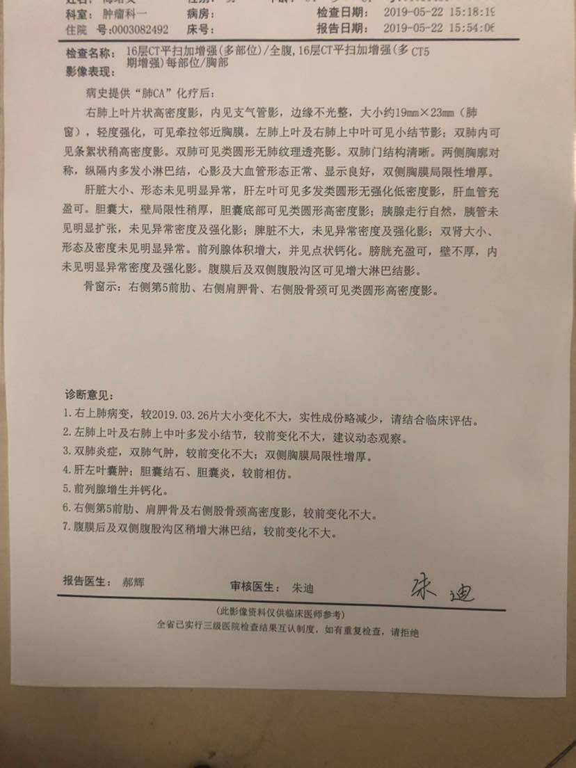 一个kras突变的晚期肺癌,确诊时心包积液,胸膜转移,双侧胸水对侧锁骨转移淋巴结3点多厘米的老爸经过21次化疗后和常人无异!一线方案卡铂培美贝伐。6次卡铂去掉又培美贝伐维持15次。共计21次化疗。中间在今年二月份主病灶缓慢长大,再各种咨询我们大夫,肿瘤医院大牛和陈波医生后选择做了消融。这次是消融后三个月的全面复查。肿标完美,血象完美,增强磁共振完美,ct完美,体感完美!现在老爸已经买完菜,在家里给我们做晚饭了。