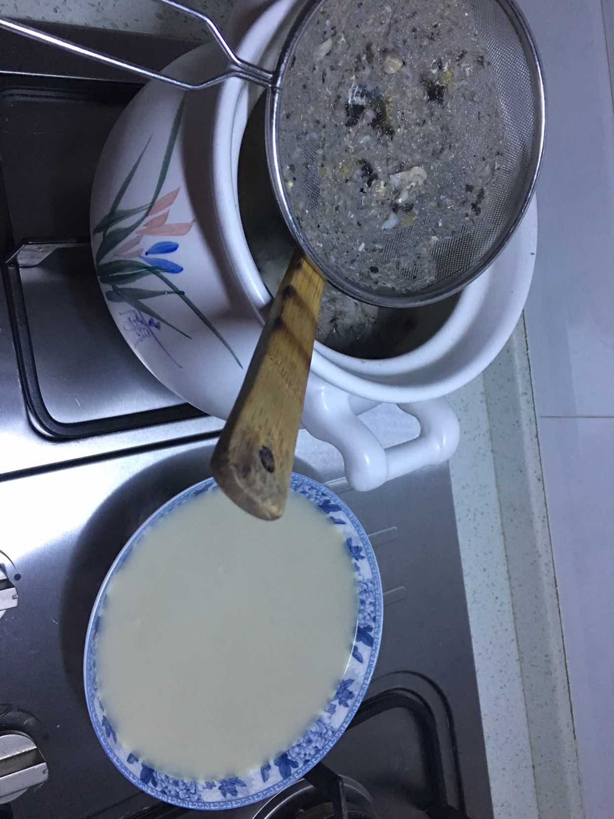 看到图片这样。骨肉分离时。找一个勺过滤出鱼汤。鱼骨头丢弃。我这个砂锅2.5升,熬煮一斤小鱼过滤出的鱼汤2000毫升。真正的浓汤哦。