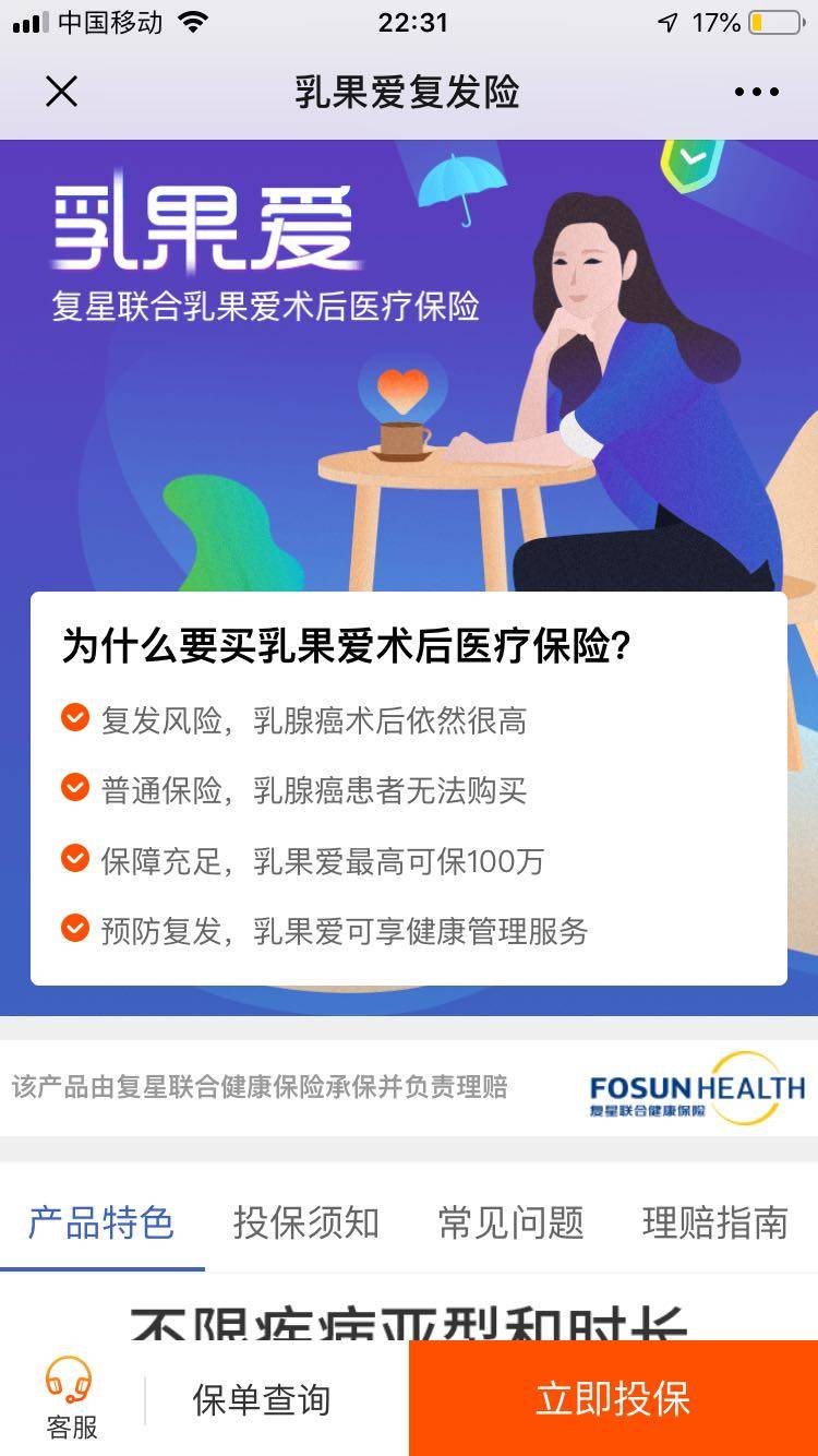 最近通过病友了解到了觅建上这款复发险!向我们这种得了乳腺癌的人想要再买保险是肯定买不了了!好在自己把社区医保交起走的!后来了解了这款觅建上的复发险之后心中还是有了再买一份保险的念头,想着自己还年轻,但是又没有什么经济来源,老公也成天想着我和离婚,一旦离婚之后靠自己恐怕有个什么情况的话真的就没有什么经济来源保障了,所以想问问大家有没有了解过这款复发保险,有没有必要买?是否值得信赖?大家看看
