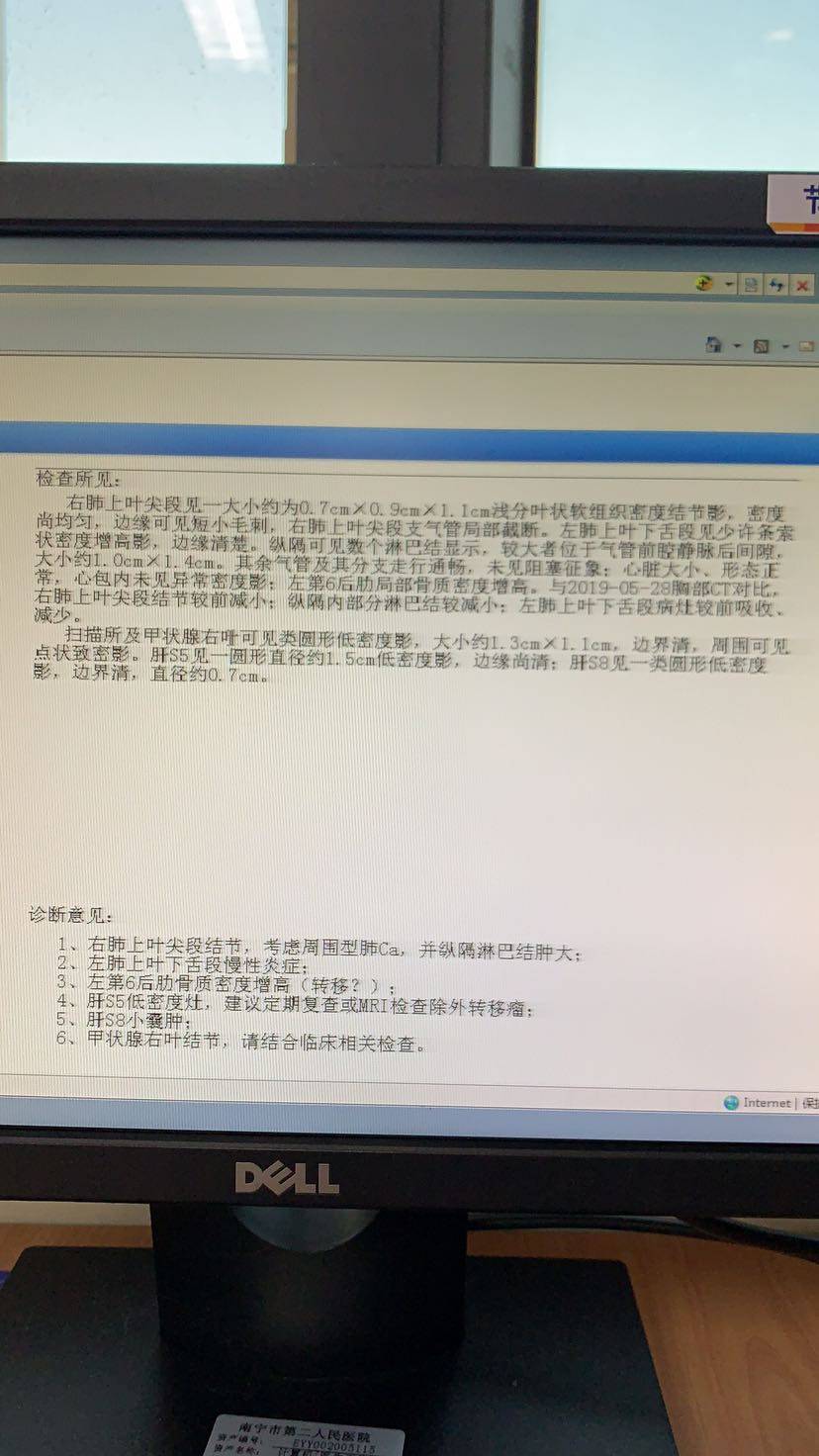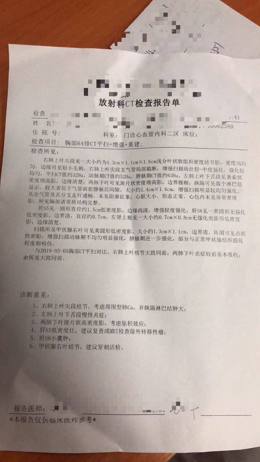 从5月28日ct结果出来的不相信,到后面肿瘤医院的确诊,接着到一系列的检查结果,肺腺癌,淋巴转移,肝转移,到基因检测(等待检测结果中进行了第一次化疗培美加洛帕)基因检测后,7月1日开始服用第一颗吉非替尼,7月10号带妈妈去了一趟泰国旅游,中途半夜有轻微咳血,后询问医生是服药正常现象,服药一个月我妈妈感觉无任何不适,就是脚趾有脱皮现象,7月22日至7月24日晚间有低烧,吃了感冒灵颗粒,好转,7月25日住院开药顺便检查(怕发低烧是肺部感染引起)7月26日拍ct,医生说没有问题,继续开一个月的吉非替尼服用,这是这一个半月以来我妈妈的治疗过程,希望妈妈可以多活一段时间,感恩所有帮助过我的大神们,顺便附上两张ct结果