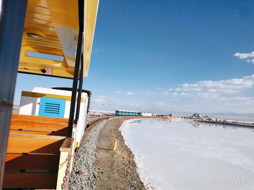 可惜我们进去晚了,没有租到鞋套。。我从小没有赤脚走路过,脚底光着,平路都走不了,更不用说光脚下盐池了,实在太疼。所以放弃进入盐湖拍照,转尔看了看风景,看了近三小时,竟然还是没让我舍得离开。小火车在8.30离开,没办法才恋恋不舍的返程。