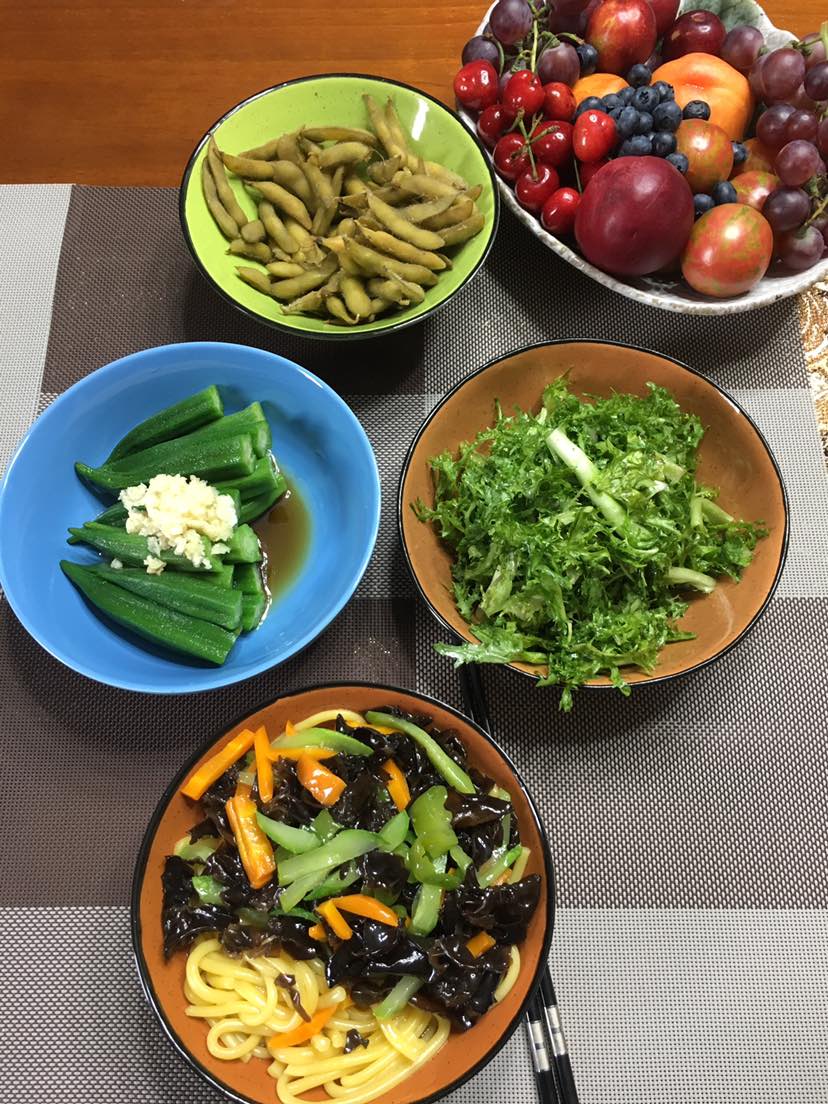 上午餐:玉米面木耳黄瓜胡萝卜打卤面/秋葵/凉拌苦菊/水煮毛豆/果盘