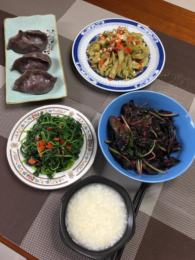 下午餐:白玉米粥/鸡蛋窝瓜蒸饺/水炒红苋菜/凉拌茄子/凉拌跟头菜加上晚餐坚果大约一天23种食物