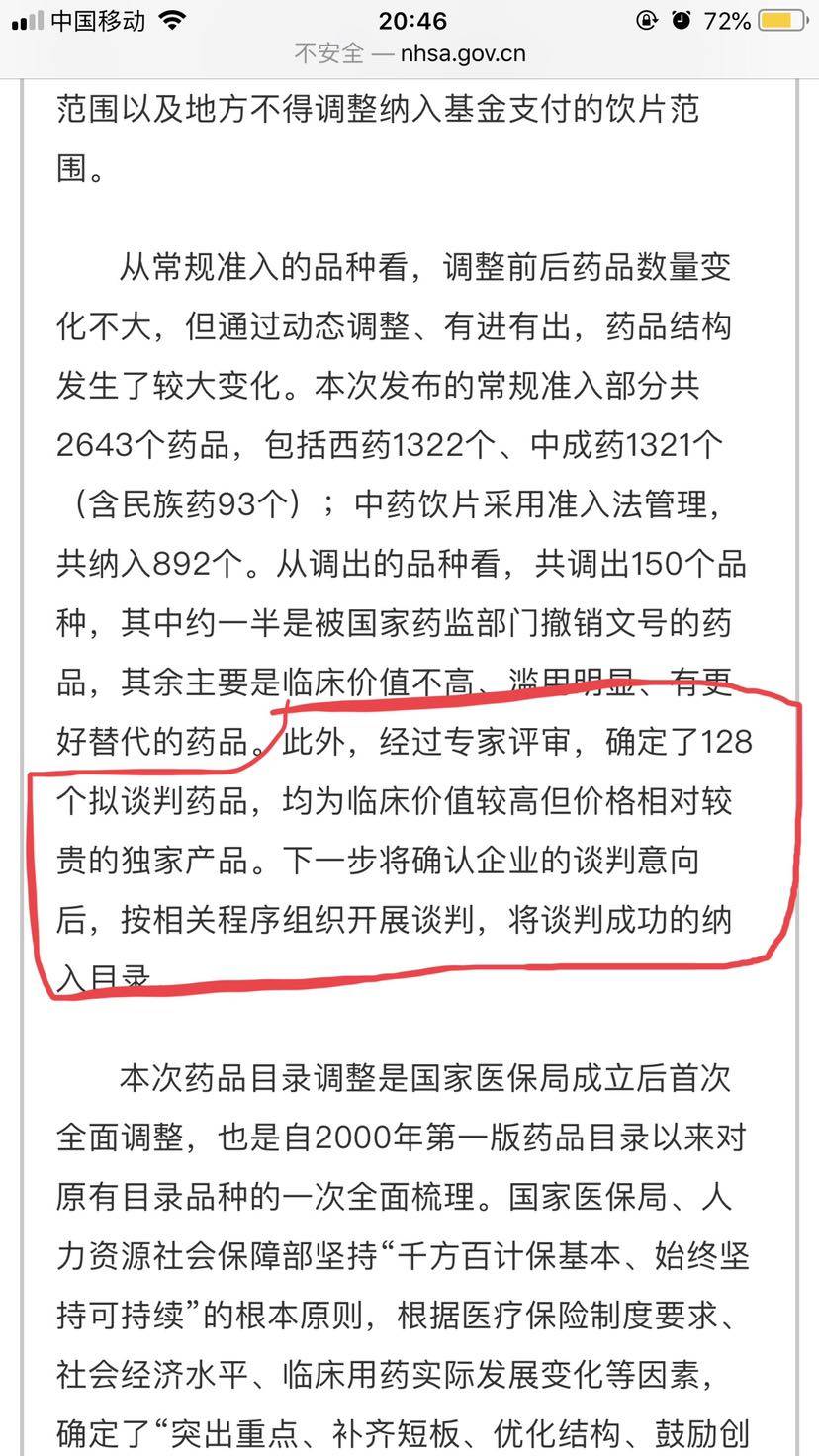 我重新研究了一下,现在还没公布“拟谈判目录”,之前搞错了,实在不好意思,请大家耐心等待。有128个拟谈判药品,现在公布的是48个协议期内谈判药品,两者不是一回事,前者还没公布,不知道是否包含奥拉,大家静静期待吧。
