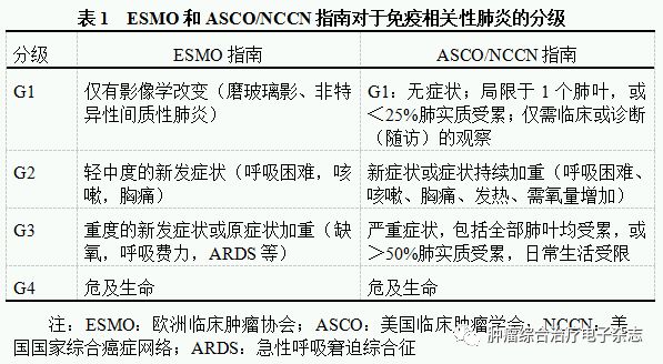 对于严重程度的评估,笔者在对ESMO指南的解读中曾有提及,认为不应该单纯依靠临床症状来判断疾病严重程度。ASCO/NCCN指南则根据临床症状、影像学表现及耗氧量综合评估疾病严重程度(表1)。但需要指出的是,目前并没有文献证实将肺脏受累的面积纳入这一分类系统可以更好地指导肺炎的管理。