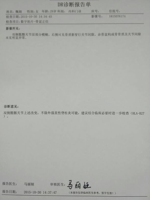 今天准备去本地医院做核磁共振,骨科专家竟不给我做,看了之前的X片子结果后,非得要我去抽血排查强直性脊椎炎,我说我想知道自己是不是骨坏了,想早点确诊几期的好点早治疗,他说确诊了几期又能怎么样,骨坏又治不好,怎么可以这样说,好无奈好无助,只是要你开个单子做个核磁,有那么难吗?干嘛要打击人!