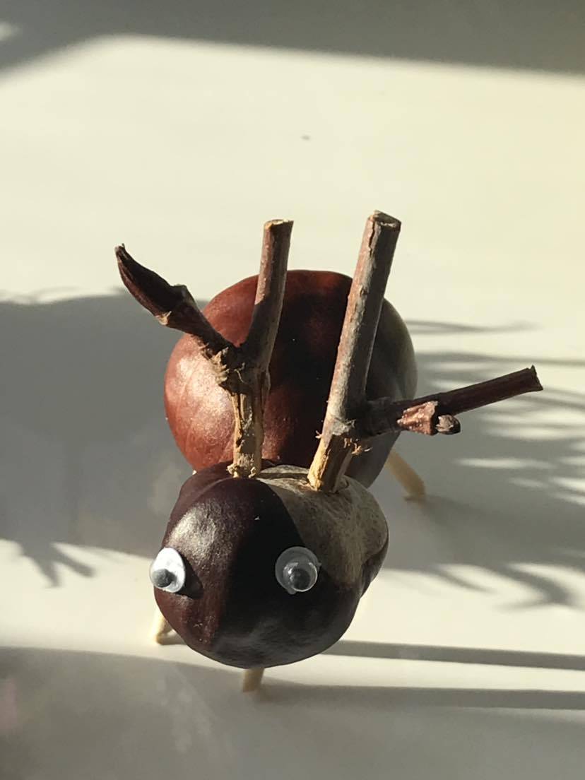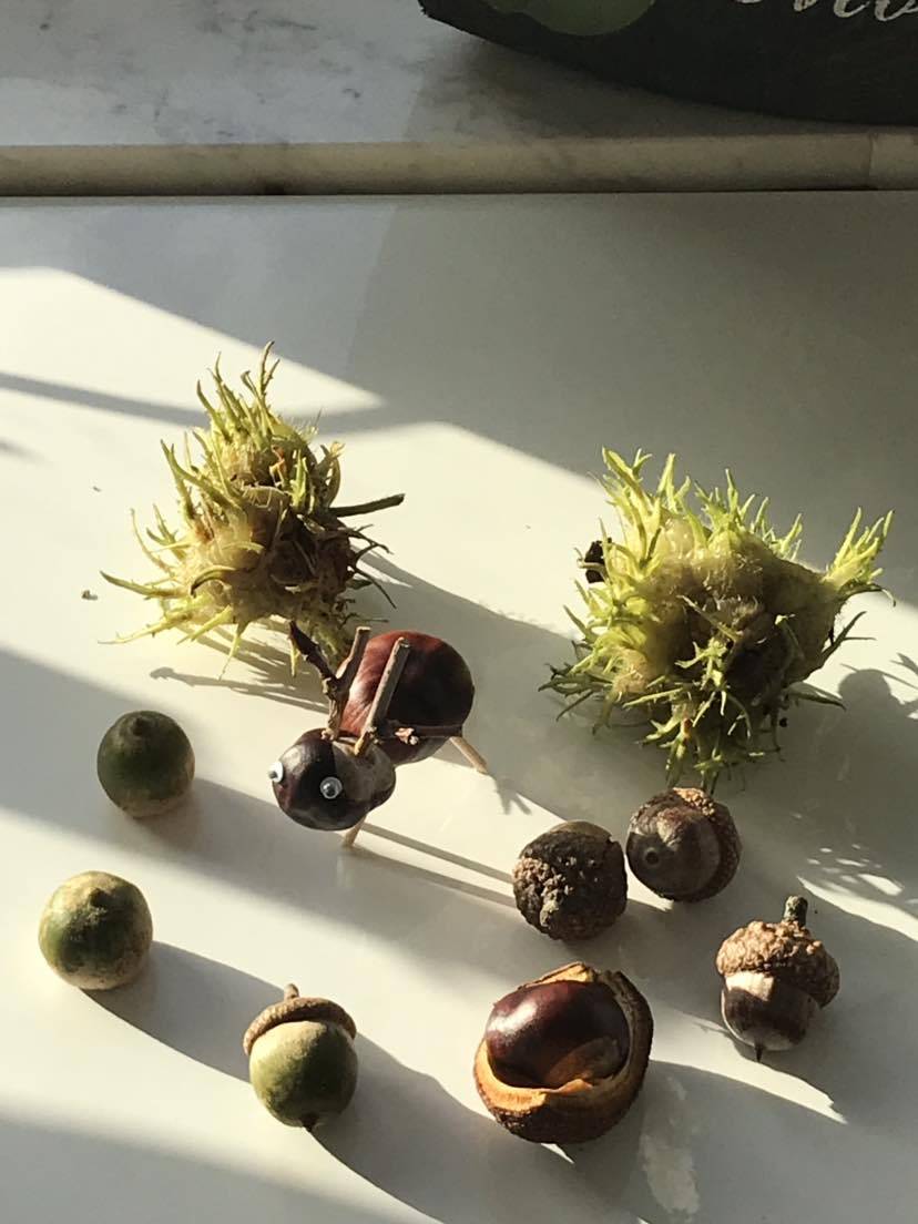 和黄叶一起飘落的还有橡子和栗子 出去散步时随意拾了些 准备做点手工哄女儿 第一件作品是两颗栗子和小树枝拼起来的小鹿 有点丑萌丑萌的 女儿很喜欢 还有一大堆在那里放着 没有什么好主意 蘑菇也做过了 小人也做过了 还得再想想 不过单纯地看着这些自然的馈赠 心情也是愉悦的