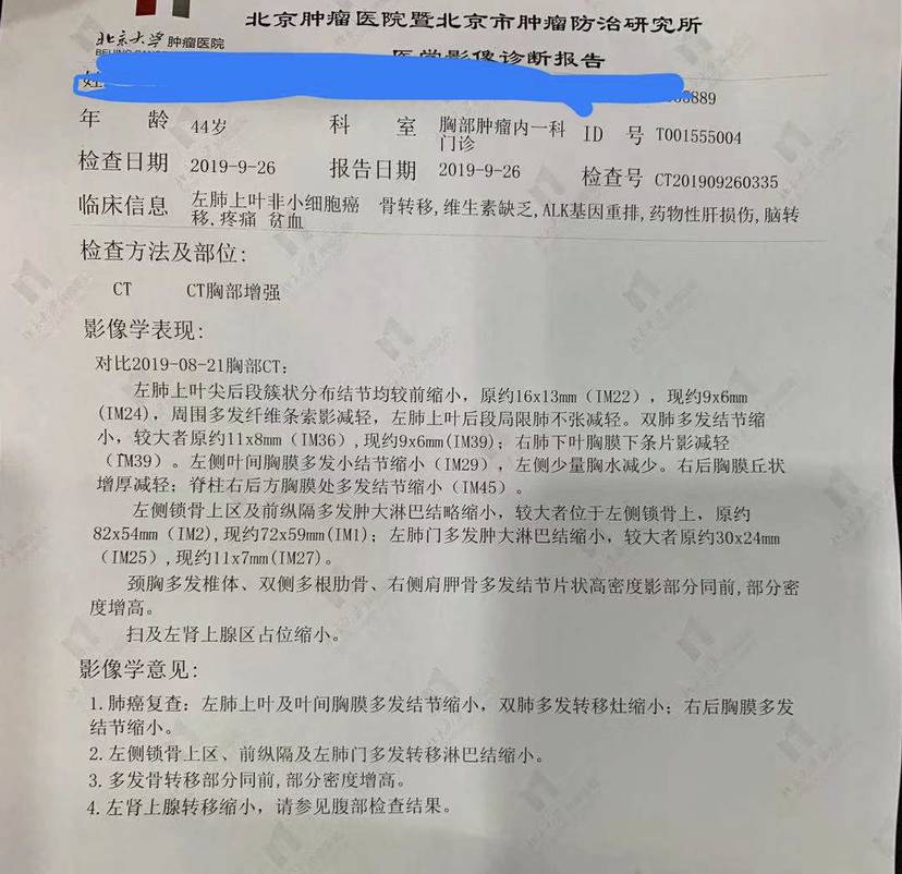我弟弟是alk,经历了化疗,吃克唑4个月发现脑转,换阿来5个月发现淋巴结转移,无奈之下吃了一个月安罗,依然无效,再次抽取淋巴结组织基因检测,pd1表达40%,换了K药,这期间经历了痛苦的颈部放疗、严重贫血和疼痛,直至第三针后评效肾上腺又发现结节,肺部一直控制较好的原发病灶也出现增加,疑似侵犯脊髓,折磨的弟弟不能走路,甚至上了尿管。只有3922一条路,巨额的费用也吃不起正版劳拉,无奈吃原料药。神奇的3922,第三天弟弟就站起来了,第五天拔掉了尿管。一个月后评效(见图片)出来除骨转无变化,脑部未查,全面改善。继续3922,希望越来越好!但是有两个关于3922的问题:1、我们刚吃了一个月是按50mg剂量,这个月准备逐步加到75mg,您对剂量是如何选择的?依据是什么?2、我们吃的是原料还是防制并不清楚来源,也不稳定,有没有稳定的渠道?非常感谢