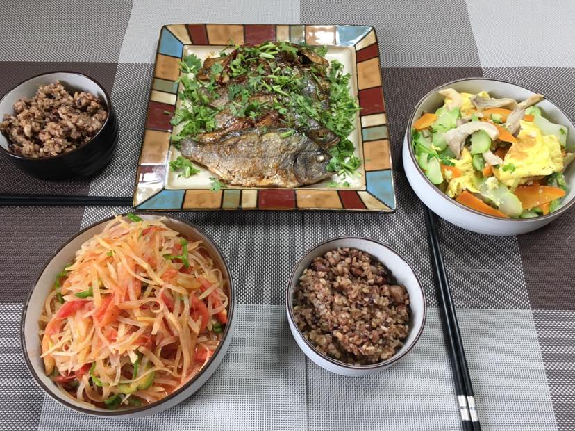 午餐:煎焖海鲫鱼/西红柿炒土豆丝/平菇鸡蛋炒佛手瓜胡萝卜/杂粮饭