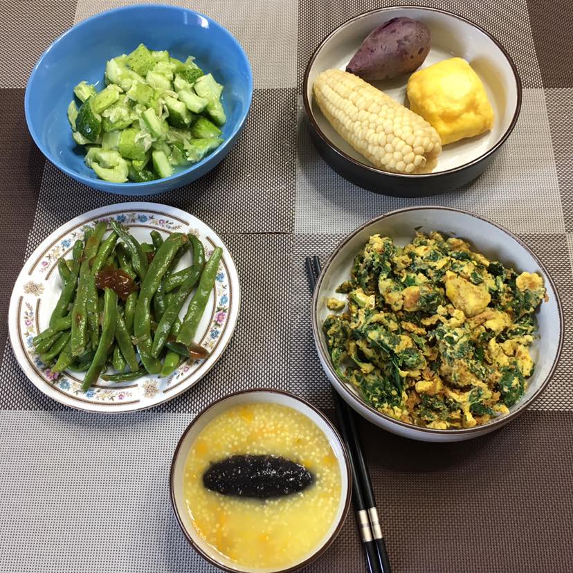 早餐:蒜蓉黄瓜/芹菜叶炒蛋/拌豆角/南瓜海参小米粥/玉米紫薯南瓜馒头