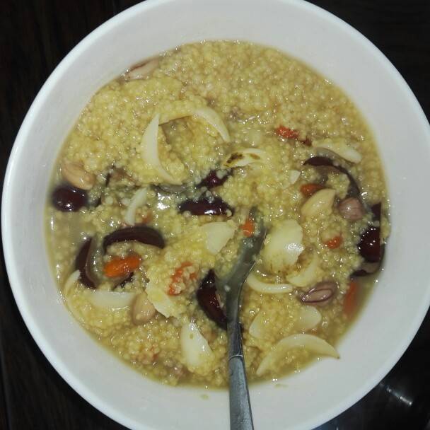 粥里面有:小米,剥核红枣,花生,百合,枸杞~