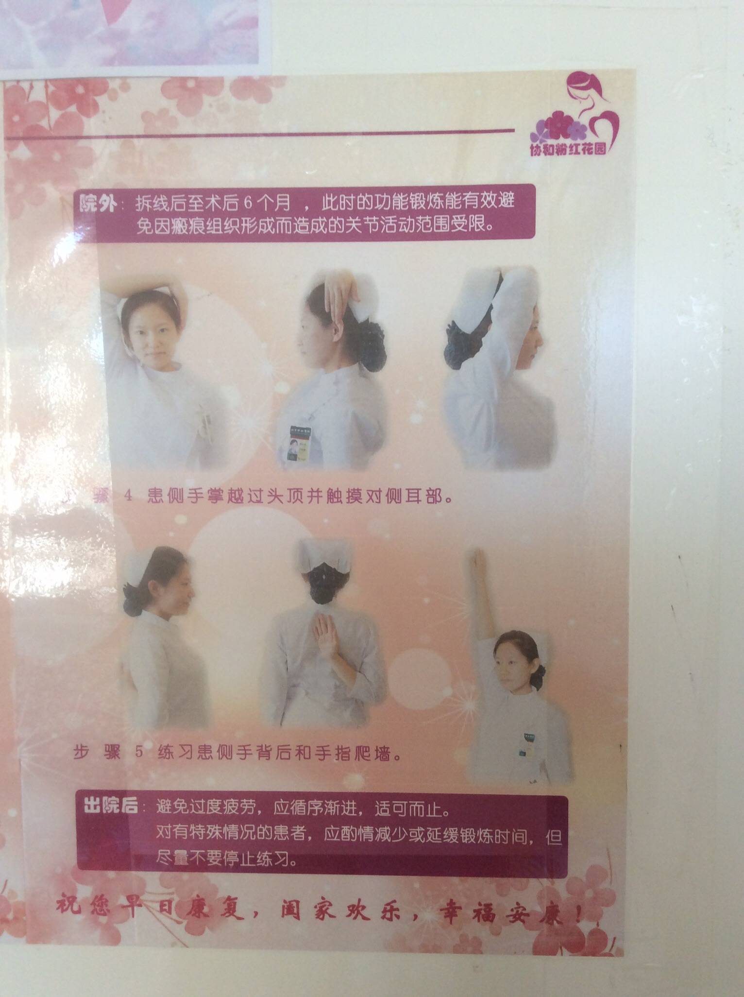 我是术后一个半月拔除腋下引流管的,拔管一个多星期手臂基本恢复正常。一方面减少患侧负重受凉,加强功能锻炼,另一方面每天早晚从腕部向臂部按摩。