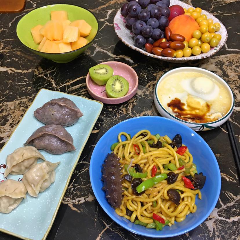 早餐:木耳青红椒炒面/蒸蛋/杂面萝卜缨蒸饺/猪肉芹菜蒸饺/水果