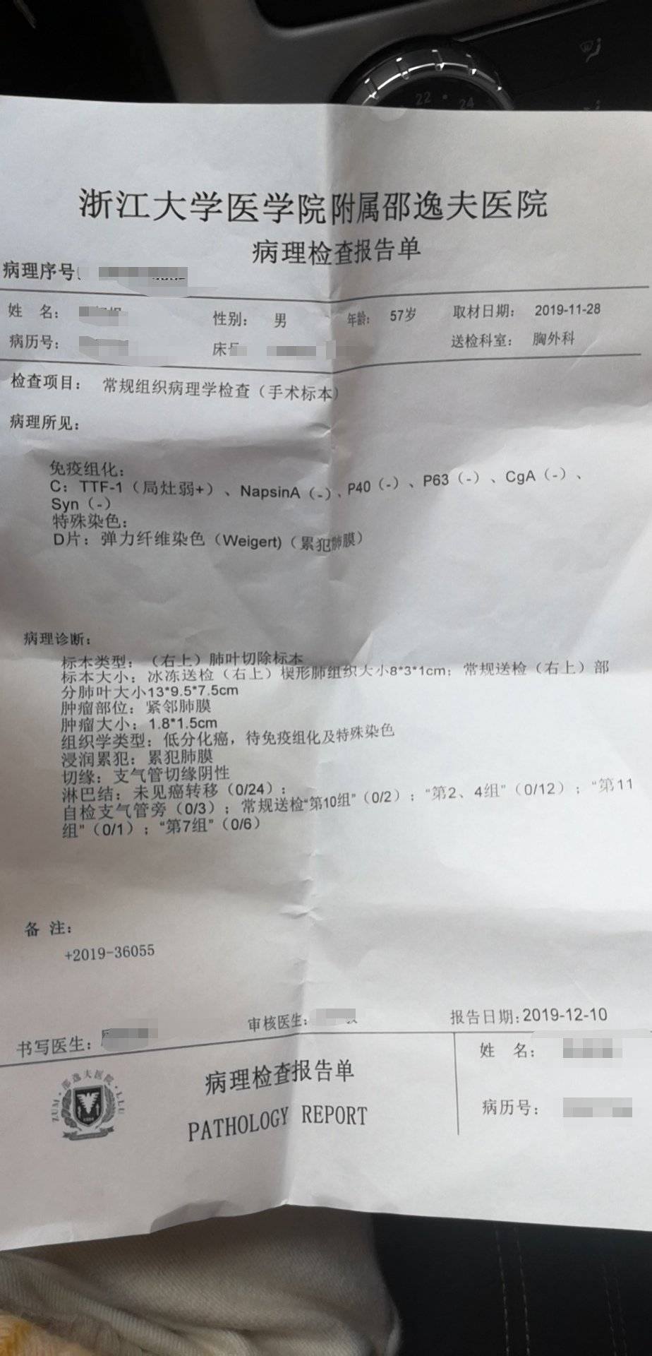 陈伊森,我爸11.27做的手术,前天手术病理报告出来了。如下所示,以及术前做的petct以及一些抽血报告。术后有些指标都不在正常范围了