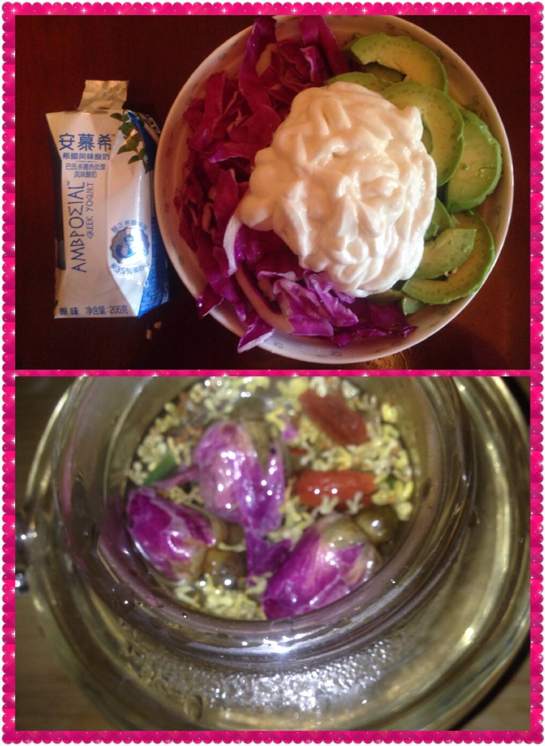每天只是看看。今天也来抒发一下情感吧!嘻嘻!中午做了香芋炖排骨、海藻拌莲藕、番茄土豆胡萝卜炖牛腩!现在泡一壶玫瑰、桂花、枸杞莲子心茶,来一个酸奶、紫甘蓝、牛油果沙拉,看一部好看的电影也是惬意的很!美中不足的就是我这持续了快两周的重感冒咳嗽外加上火嘴上起大泡,各种药各种偏方用尽我也是真的没办法了!只能吃点喝点给自己一点安慰!话说这安慕希酸奶喝起来味道有点怪做沙拉却是真真的好吃,还有牛油果真是美味又好玩,果实可以种盆栽,我每天都种一个,希望早点发芽!