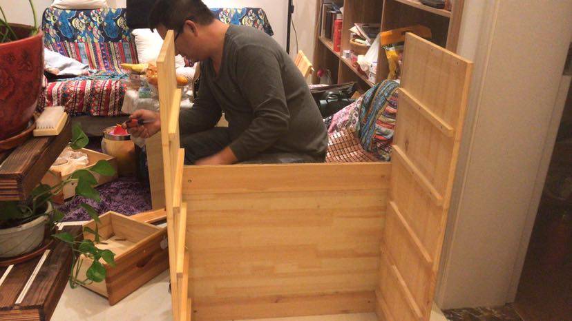 九月底,他陪我回去接妈妈,顺便去姑姑家玩了下。我说想要姑姑家的柜子,他二话不说给拆回来了。