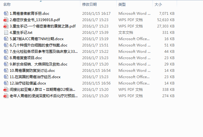 下面,我罗列一个列表,大家看下需要哪些胃癌相关的资料,点击“阅读原文”,在帖子下面回复想要资料的名称或者序号,康复君将按照你们的回复,私信给你们。