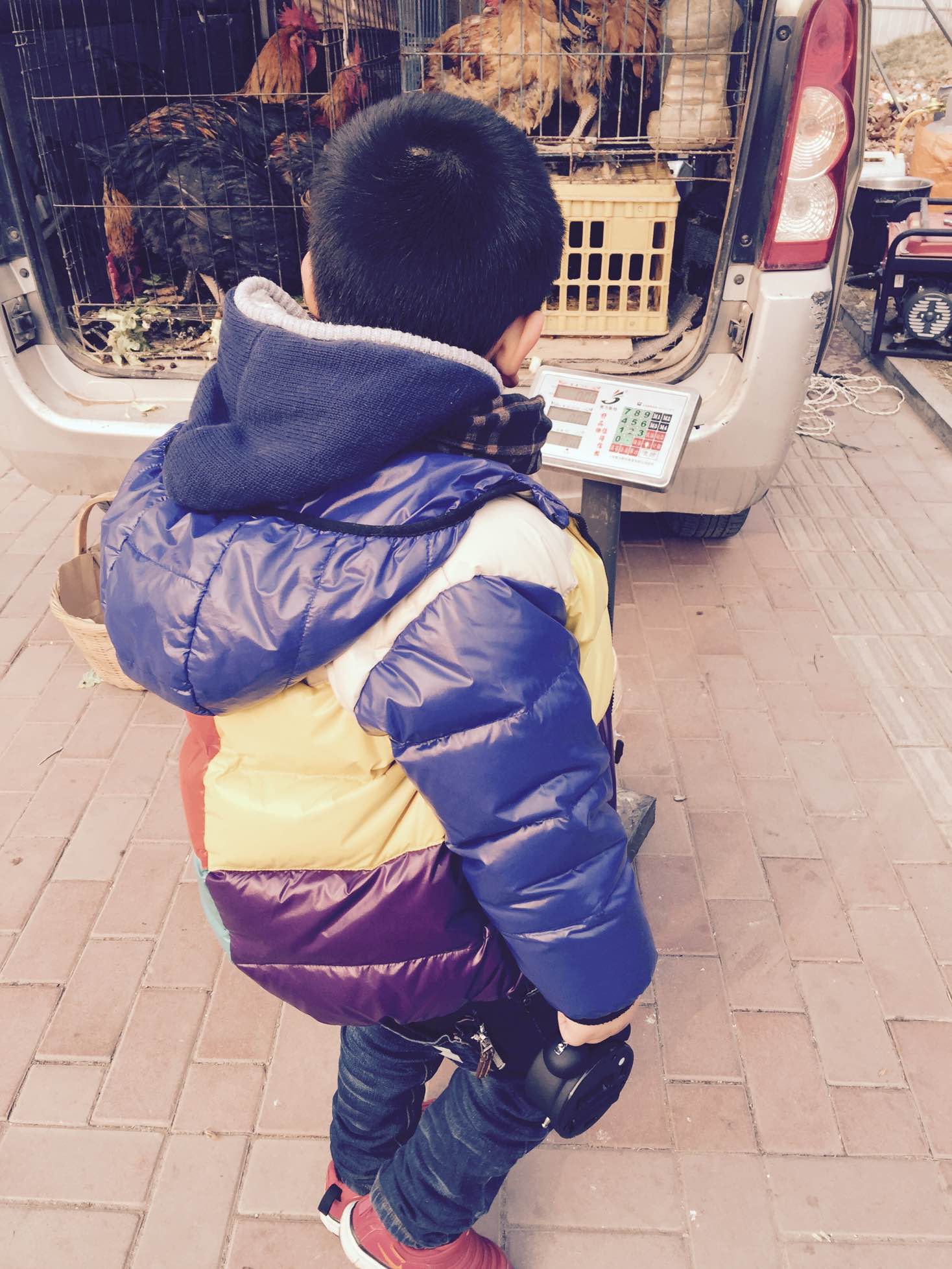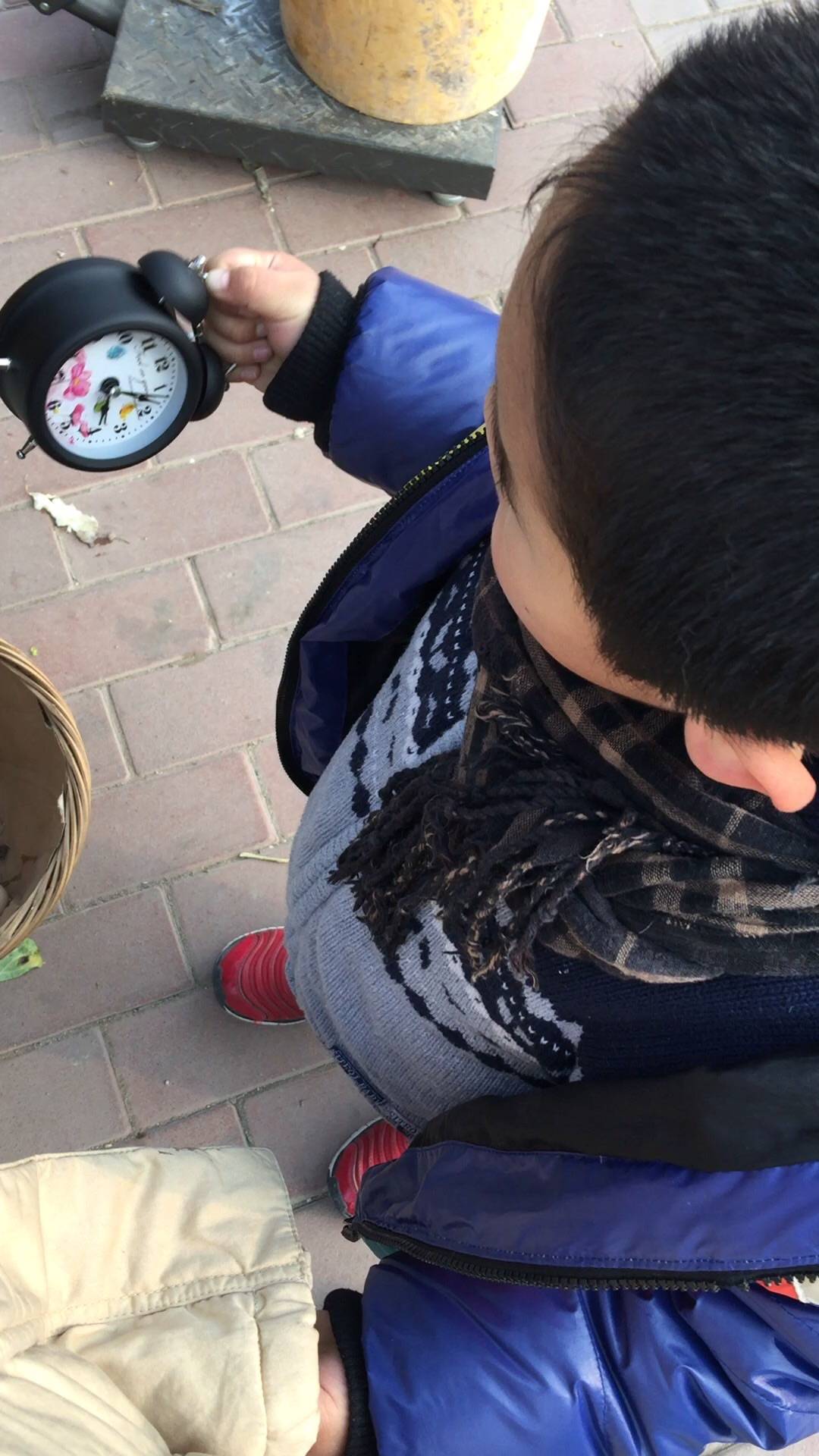 今天温度尚可无风,就领孩子楼下转悠,小区门口有卖大公鸡的。孩子数字敏感,捎带着喜欢一切带数的东西。就这样下楼看卖公鸡的也得手拎个小闹钟,是得有多喜欢表。当他看那老爷爷把公鸡放进热水里拔毛了,他自己不敢过去看,就拉我手说:我要和妈妈一起看大公鸡洗澡。。。看着那老爷爷终于拔完鸡毛了拿水冲了下,孩子又和我说:妈妈我想让这个大公鸡叫,我实在是不太会解释了,只好说,你看这大公鸡闭上眼睛睡着了所以不能叫了,他围着转了两下子看了又看,这才算放弃。。。