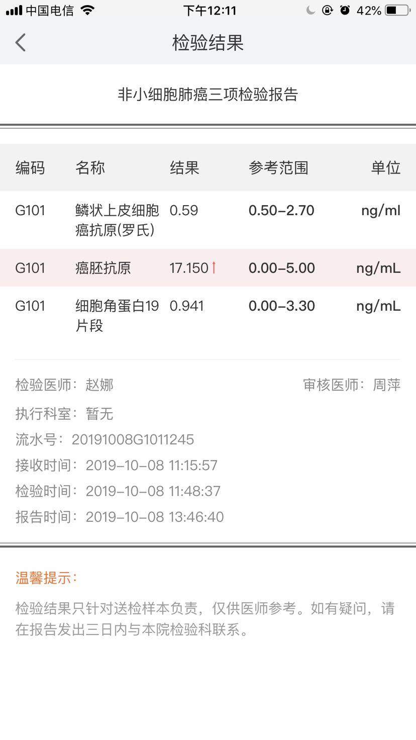 各位老师,我母亲肺腺癌,3A期,根治手术,做了肺叶切除和淋巴清扫。目前第一次巩固化疗结束20天,今天体检发现癌胚抗原升高。图片,第一张是术前20天,第二张是术前1天,第三张是术后1个月,第四张是今天,第一次化疗20天后。请问啥原因?是培美卡伯方案无效吗?